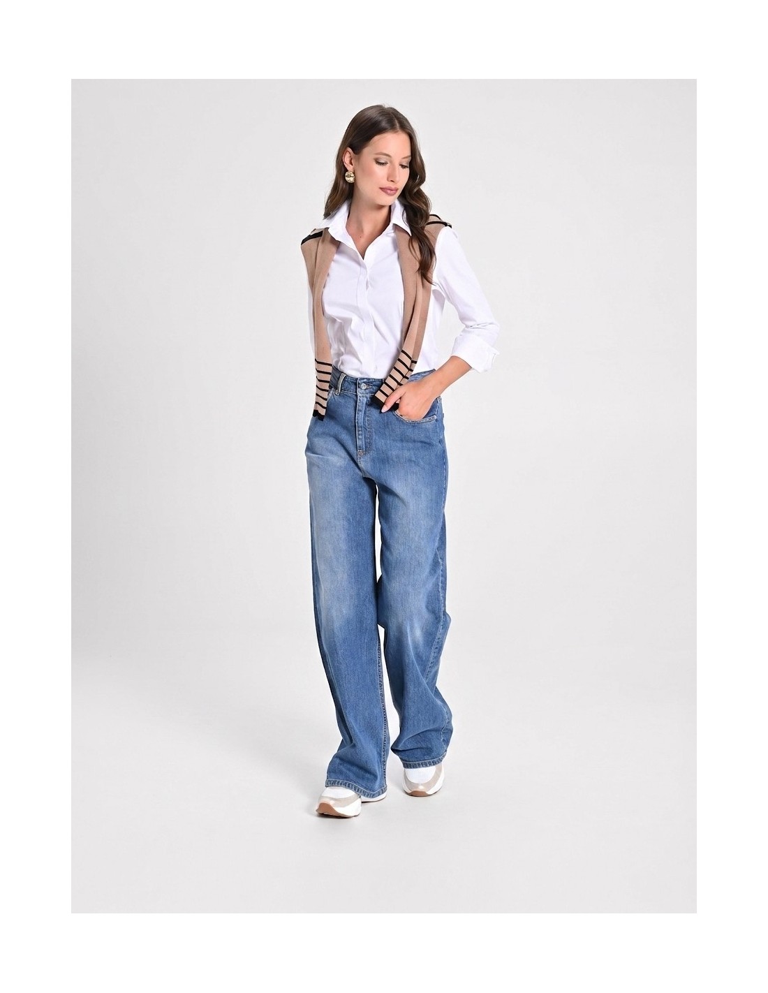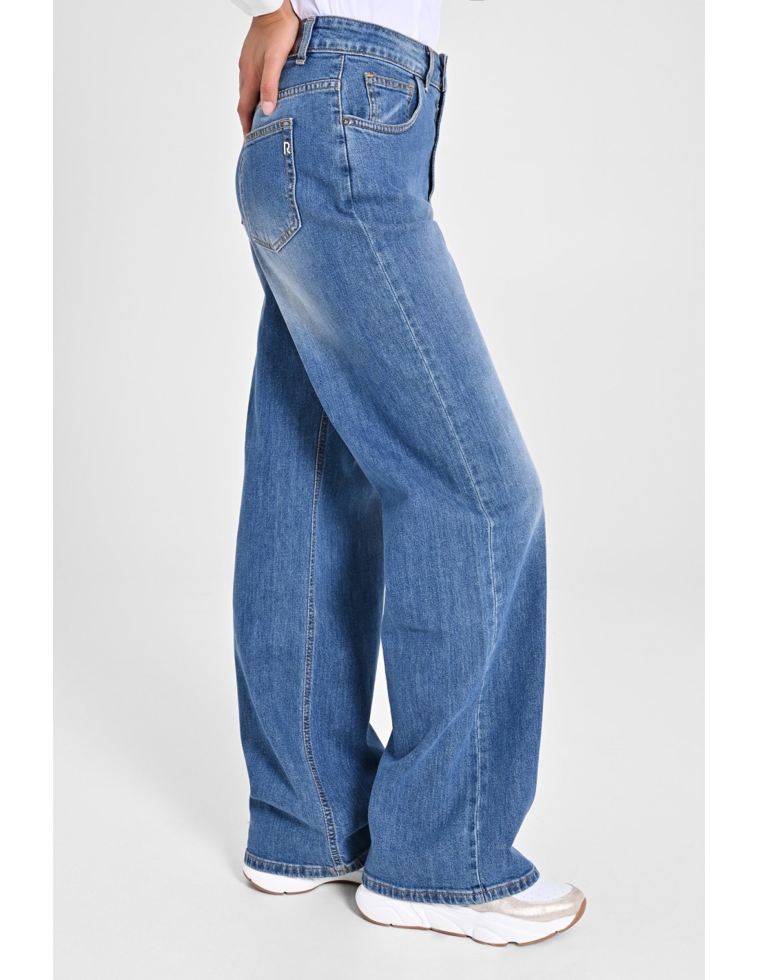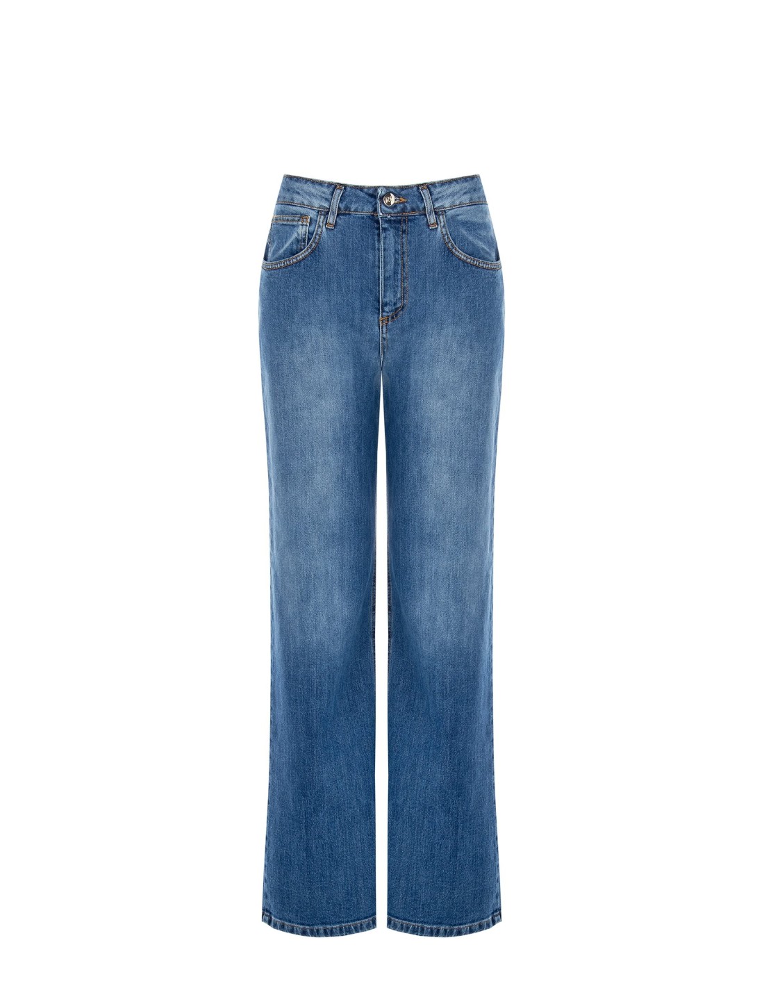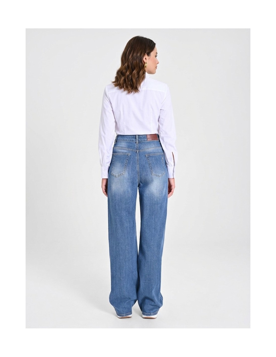 Jeans de perna larga em ganga macia com caimento fluido e alongador, com cintura alta que valoriza a silhueta e acompanha os movimentos com conforto. Cinco bolsos e fecho com botão e fecho de correr acrescentam um toque autêntico. Perfeito do escritório ao tempo livre.