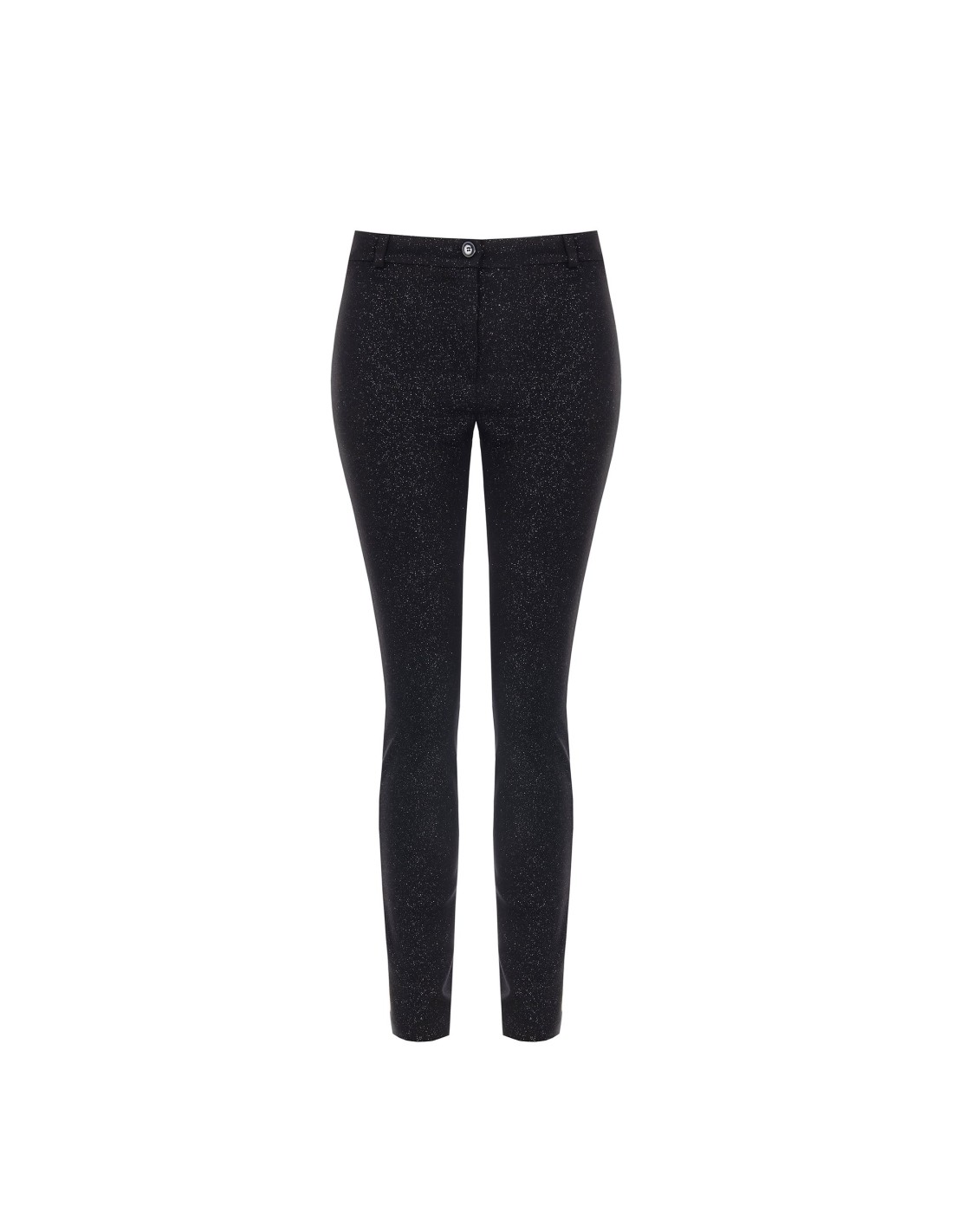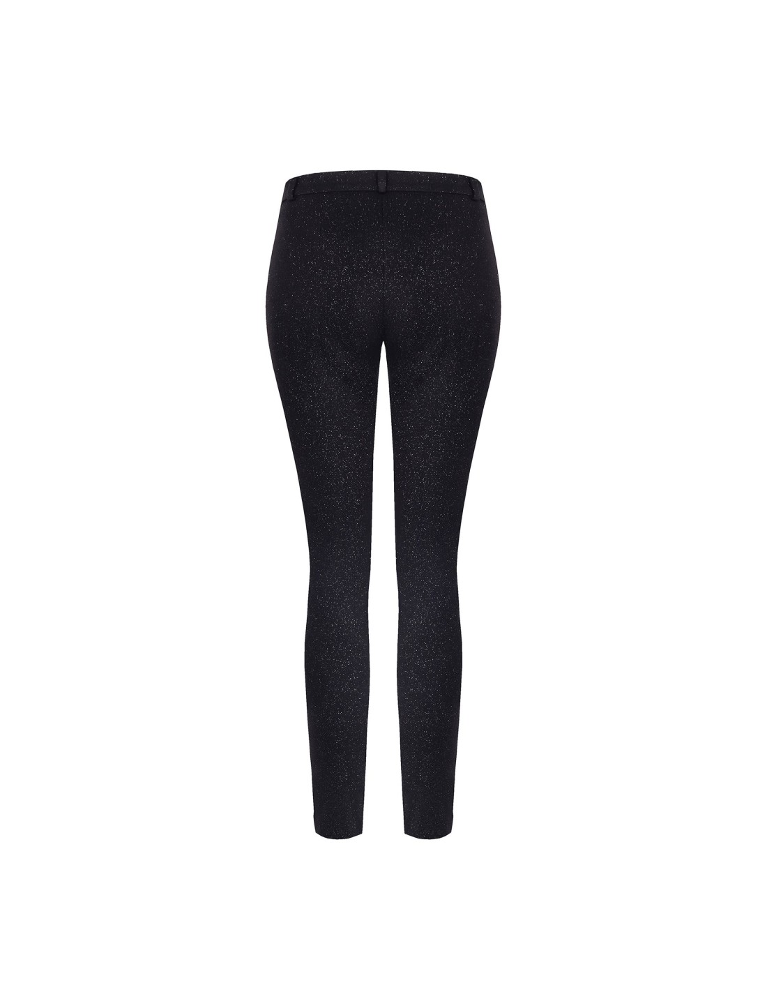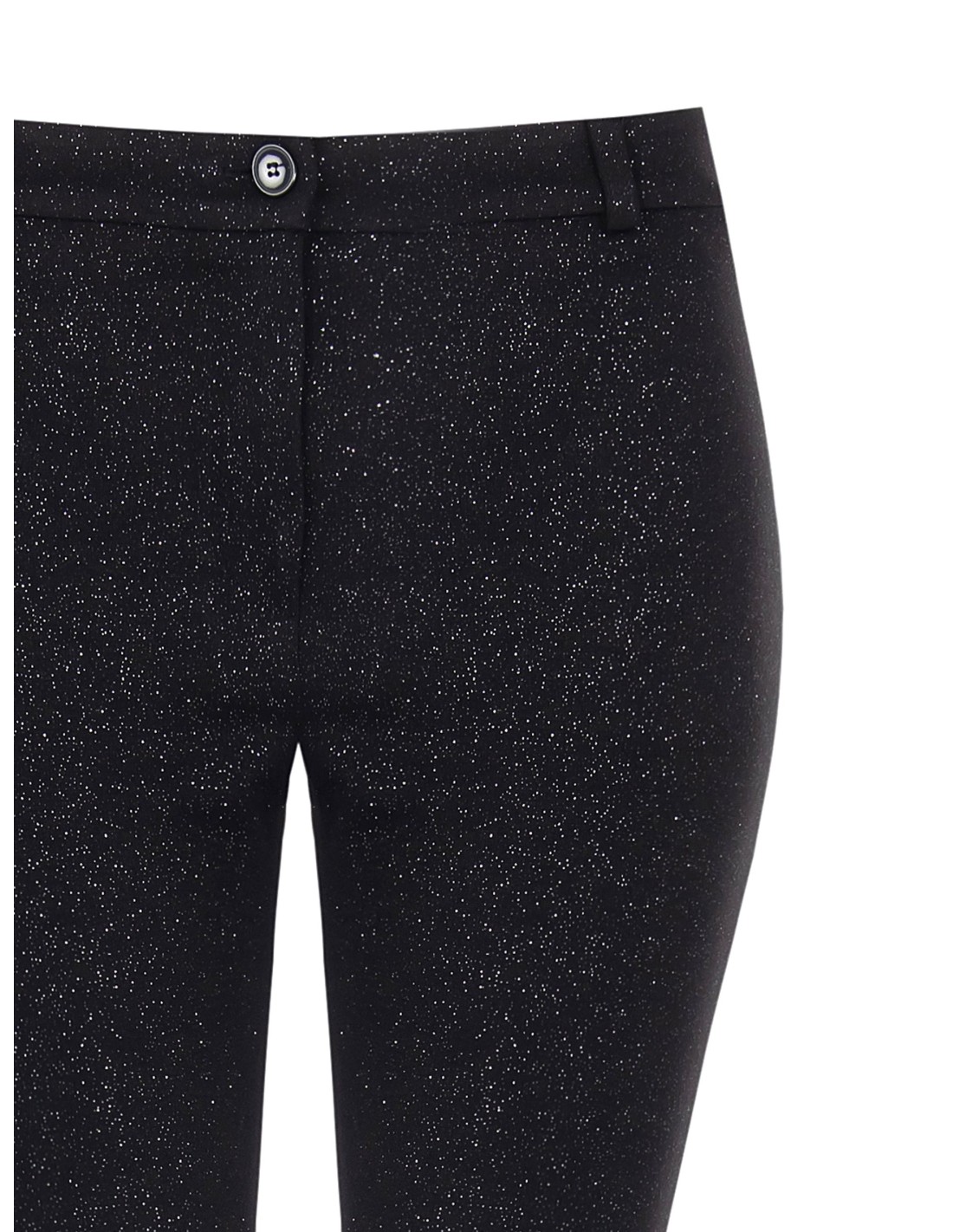 Corte slim com um ajuste justo que acompanha a silhueta com conforto e alonga a figura. O tecido stretch com textura luminosa efeito lurex acrescenta carácter, enquanto o fecho com botão e os passantes na cintura definem o estilo. Perfeito do escritório ao aperitivo, até às festas.