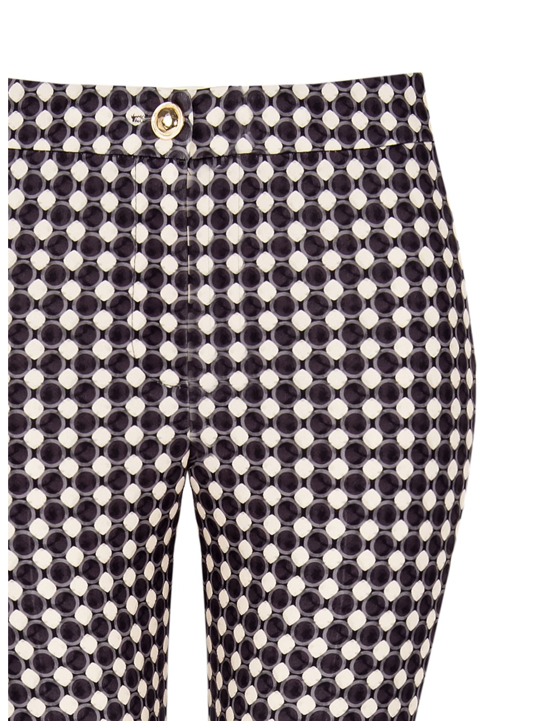 Corte slim de cintura alta que esculpe a silhueta. Tecido jacquard elástico com micro padrão gráfico para conforto e sustentação. Fecho com botão bijuteria e bolsos invisíveis para uma linha limpa. Perfeitos para o escritório com blazer, ideais também para after-work com sandálias e top.