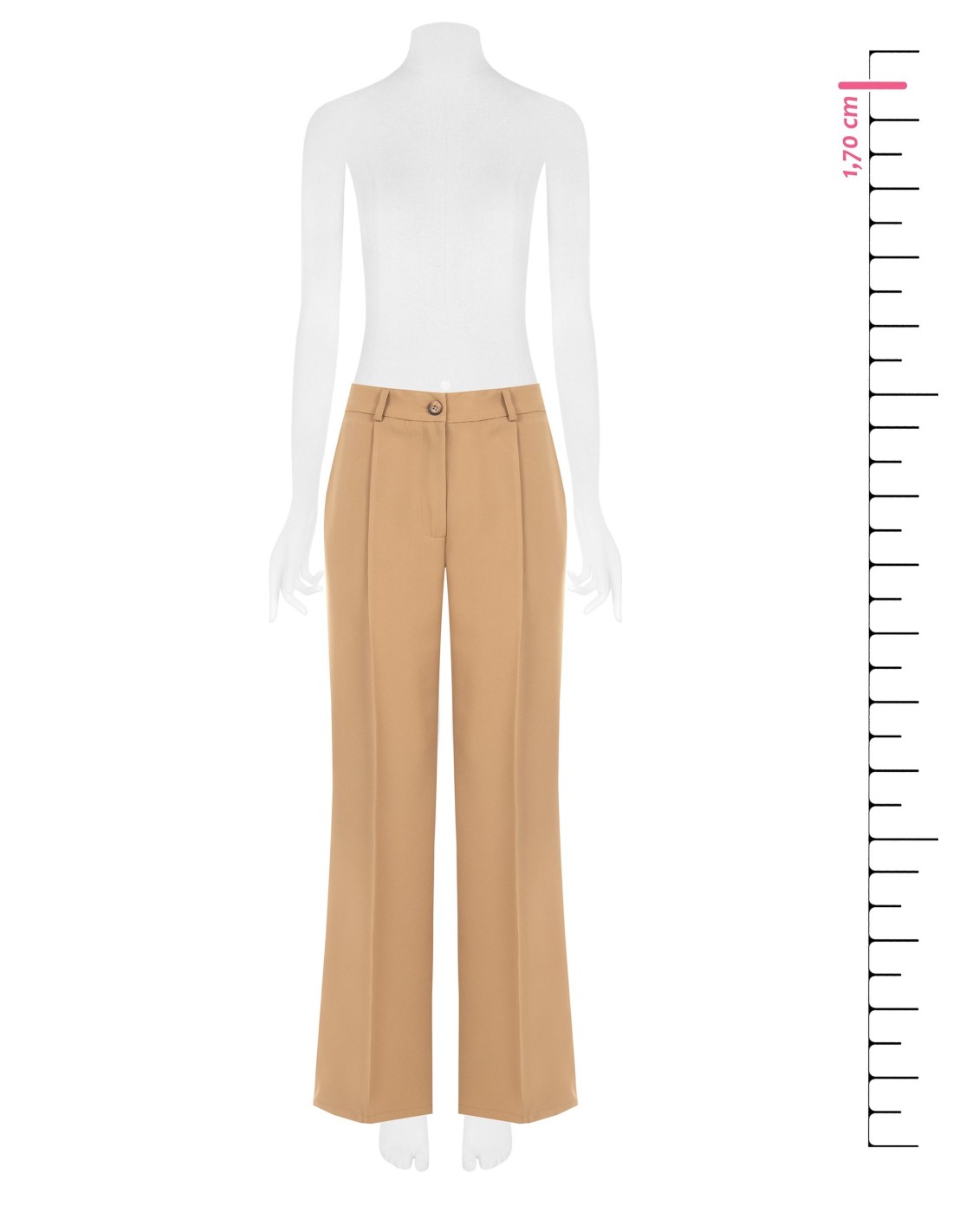 Corte direito com cintura média, perna fluida que alonga a silhueta. Tecido técnico macio com ligeiro stretch para conforto durante todo o dia. Pregas vincadas e faixa com botão definem a linha; bandas laterais em contraste dão um toque urbano. Ideal para escritório, aperitivos e elegância do dia a dia.