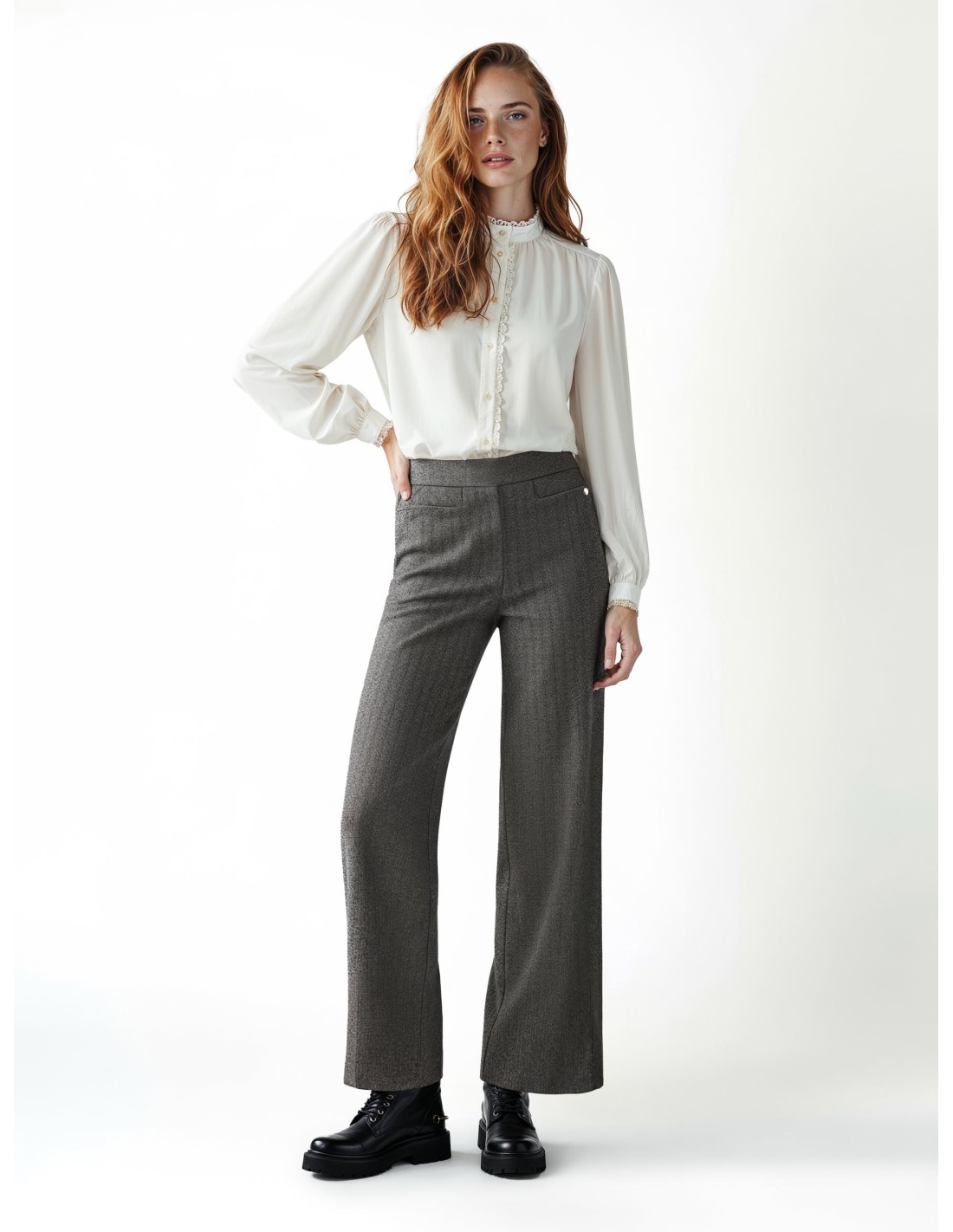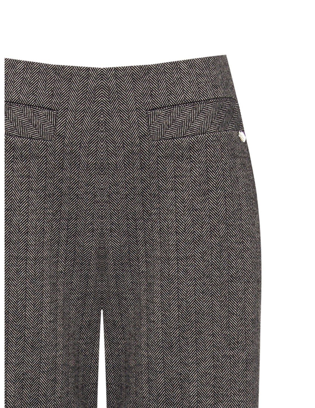 Corte reto e cintura média para um ajuste confortável que alonga a silhueta. Tecido macio com padrão espinha de peixe, elástico para se mover com facilidade. Bolsos com aba e micro-pingente metálico adicionam um toque requintado. Perfeito do escritório ao aperitivo: elegante, versátil, sempre impecável.