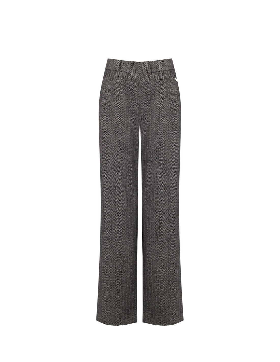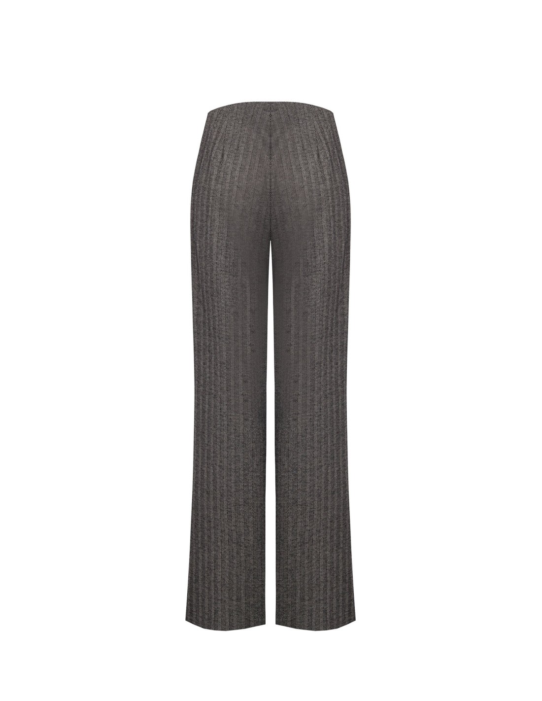 Corte recto e cintura média para um ajuste confortável que alonga a silhueta. Tecido macio com padrão espinha-de-peixe, elástico para se mover com facilidade. Bolsos com aba e micro-pendente metálico acrescentam um toque requintado. Perfeito do escritório ao aperitivo: elegante, versátil, sempre impecável.