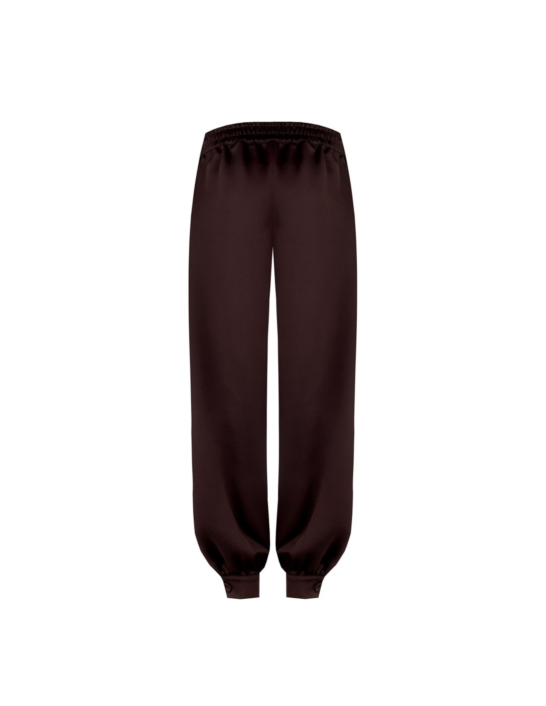 Jogger de corte macio e cintura média que alonga sem apertar. Confeccionado em cetim fluido com efeito sedoso para uma queda elegante. Bainha com punho e botão, micro-logo metálico na cintura. Versátil: perfeito com blazer para o escritório ou com top e sandálias para o aperitivo. Conforto e estilo num só gesto.