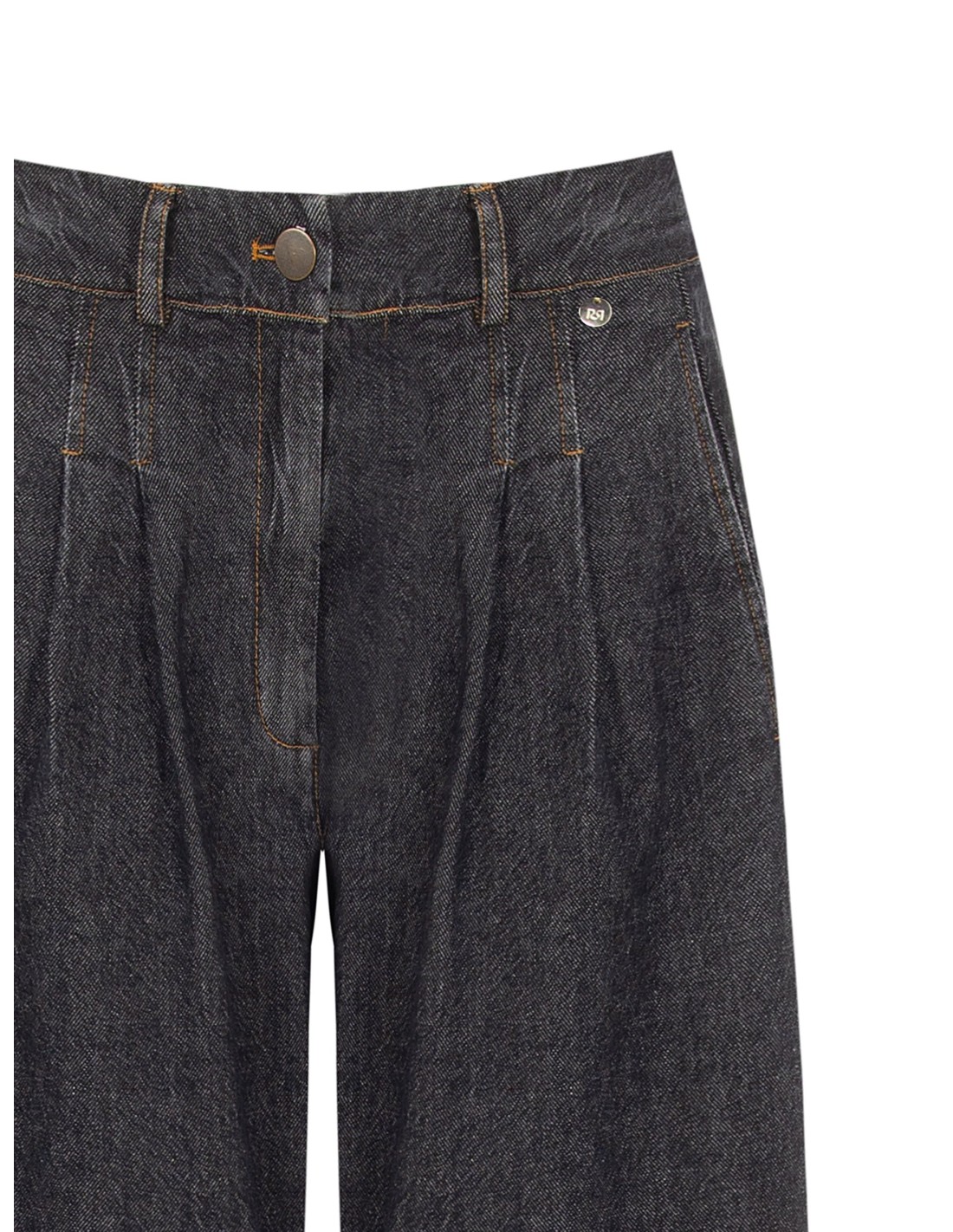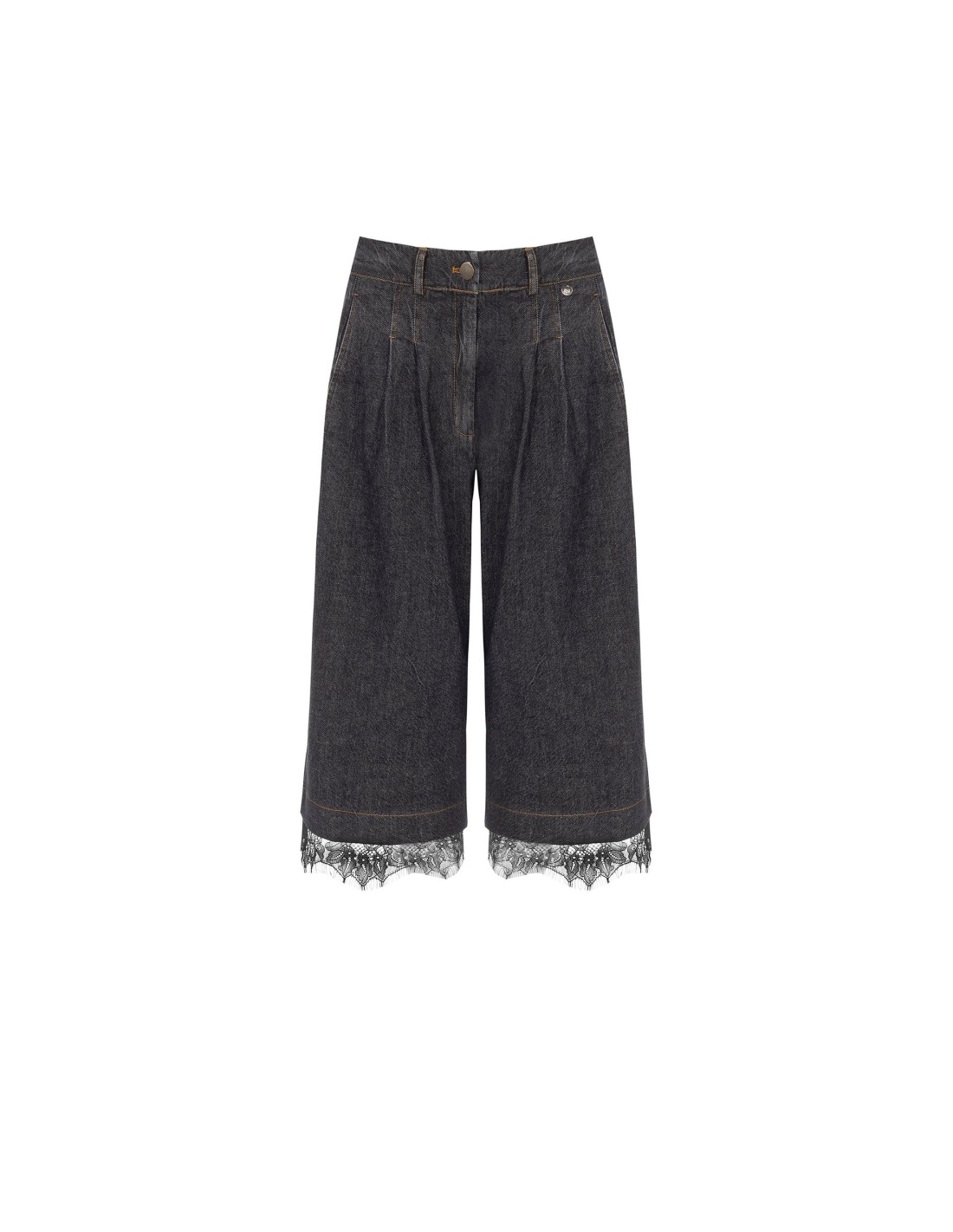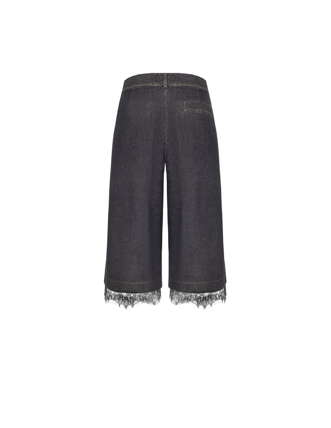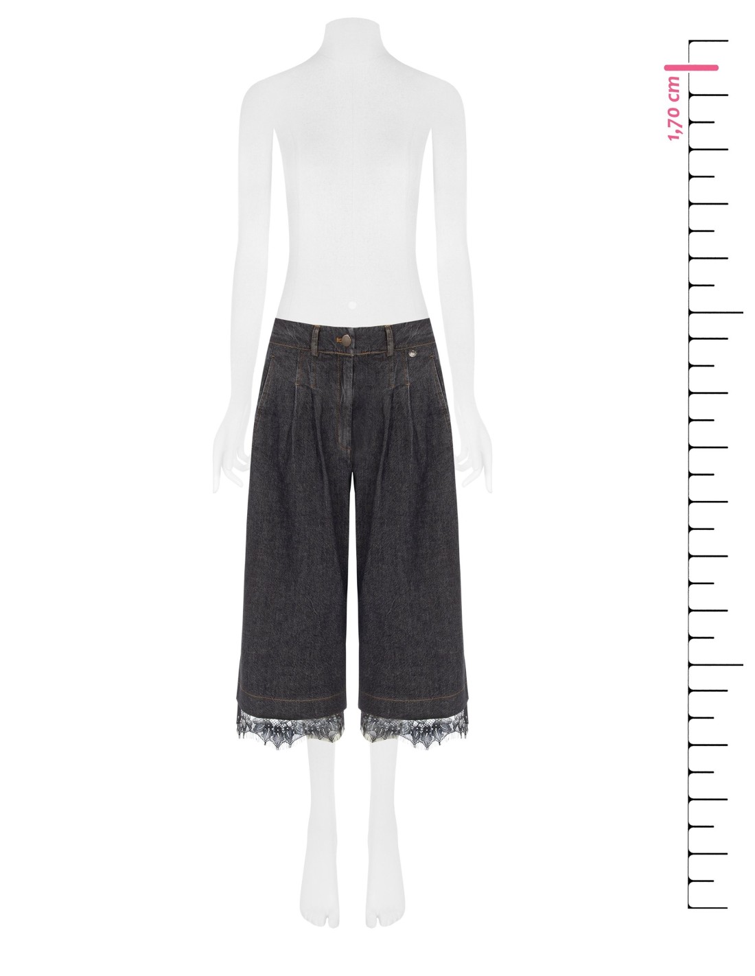 Culotte em ganga macia, cintura regular e perna ampla para uma silhueta fluida e confortável. Textura compacta com pregas frontais e bainha acabada com renda escalonada: um toque feminino que alonga. Fecho com botão e fecho de correr. Perfeitas do escritório ao tempo livre, também com saltos ou ténis.