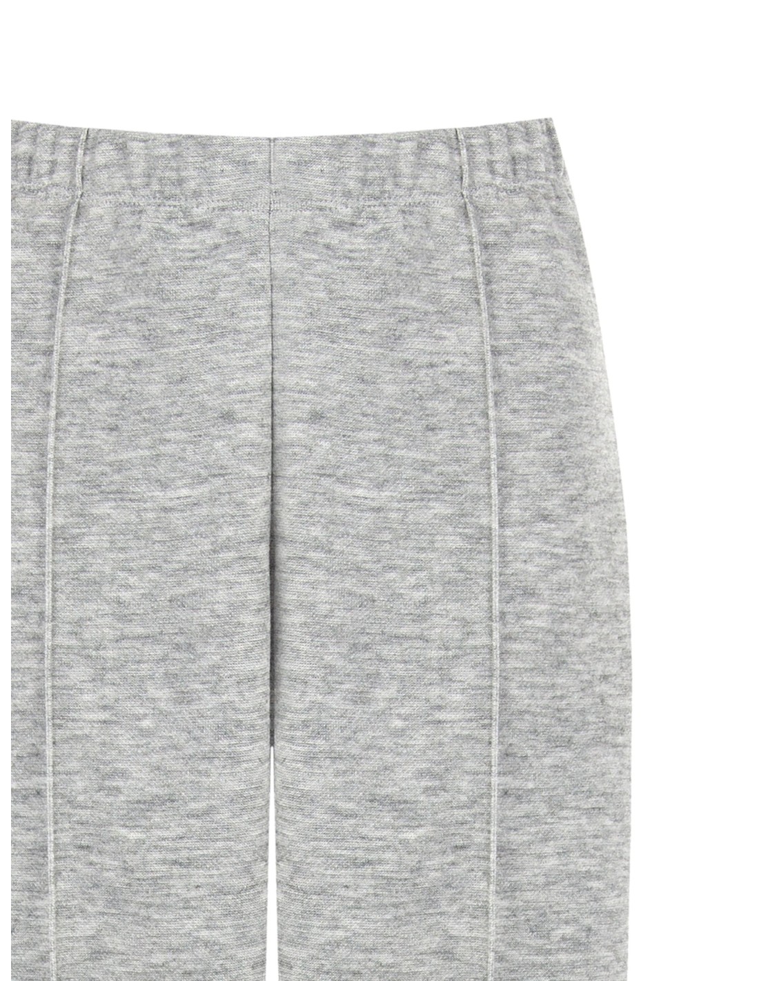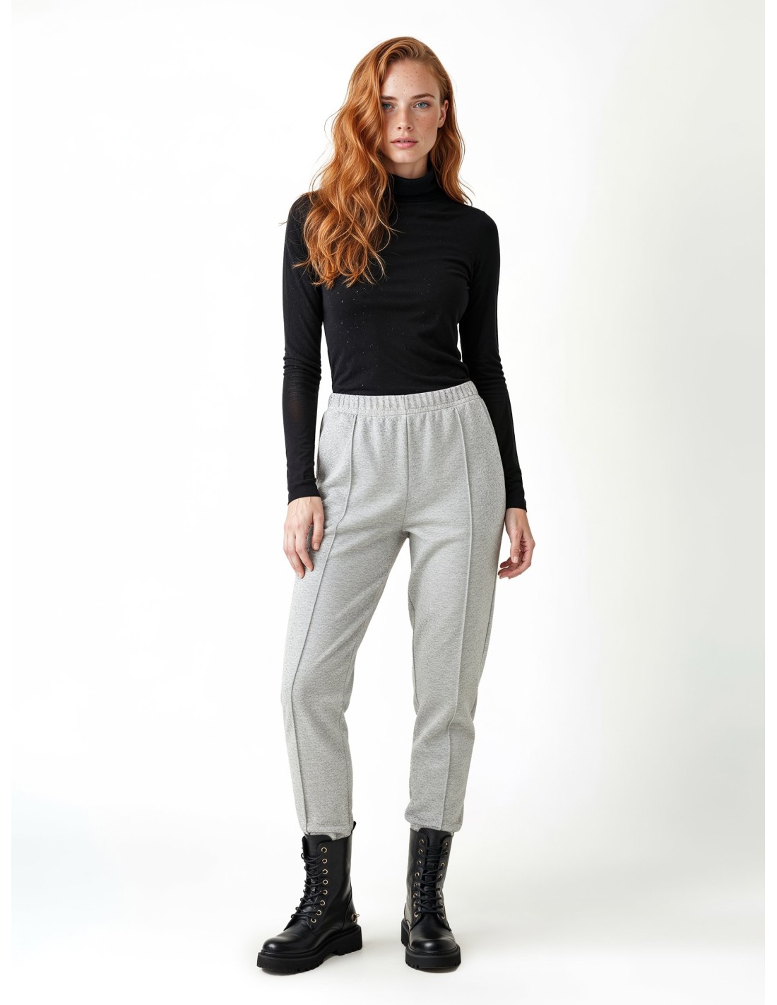 Silhueta suave com perna reta, cós elástico para conforto quotidiano. Confeccionado em felpa compacta e macia ao toque, valoriza a silhueta com costuras verticais que alongam. Barra ligeiramente afunilada. Perfeito para o dia a dia e tempo livre, adapta‑se também a looks de viagem ou casual Friday.