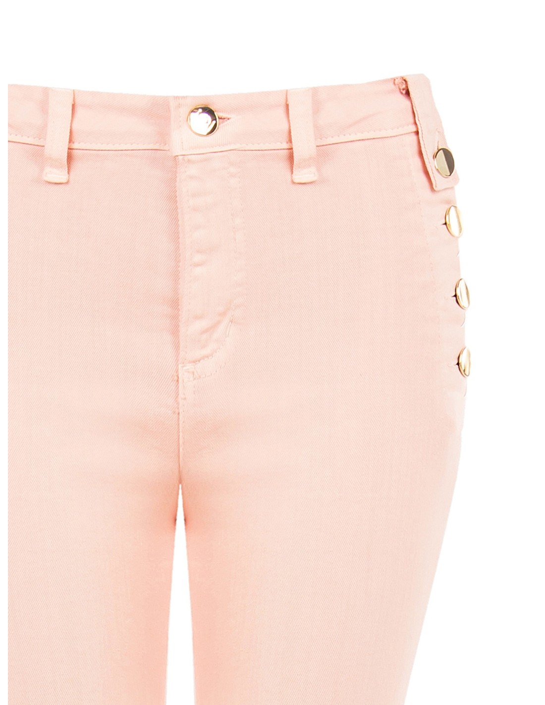 Jeans de corte ajustado que acompanham a silhueta com conforto, graças ao denim stretch de textura compacta e macia. Os botões decorativos nos quadris e o fecho frontal limpo acrescentam um toque refinado. Perfeitos do escritório ao aperitivo, com blazer ou camisolas leves.