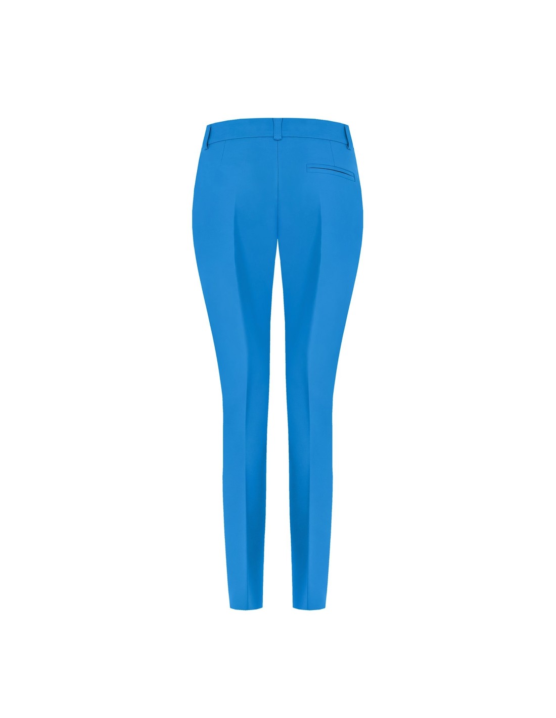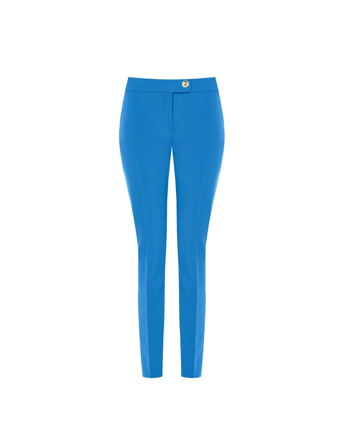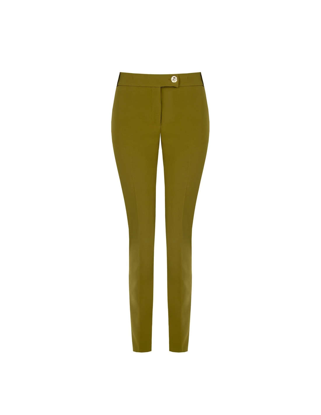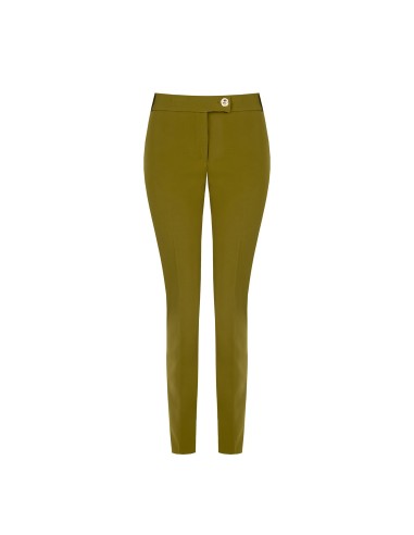 Silhueta afunilada com cintura regular, corte justo que alonga. Confeccionados em tecido técnico elástico, acompanham os movimentos e mantêm a forma. Vinco frontal marcado e botão joia na cintura para um toque distintivo; bolso de embutir na parte traseira. Perfeitos do escritório ao aperitivo, com saltos ou mocassins.
