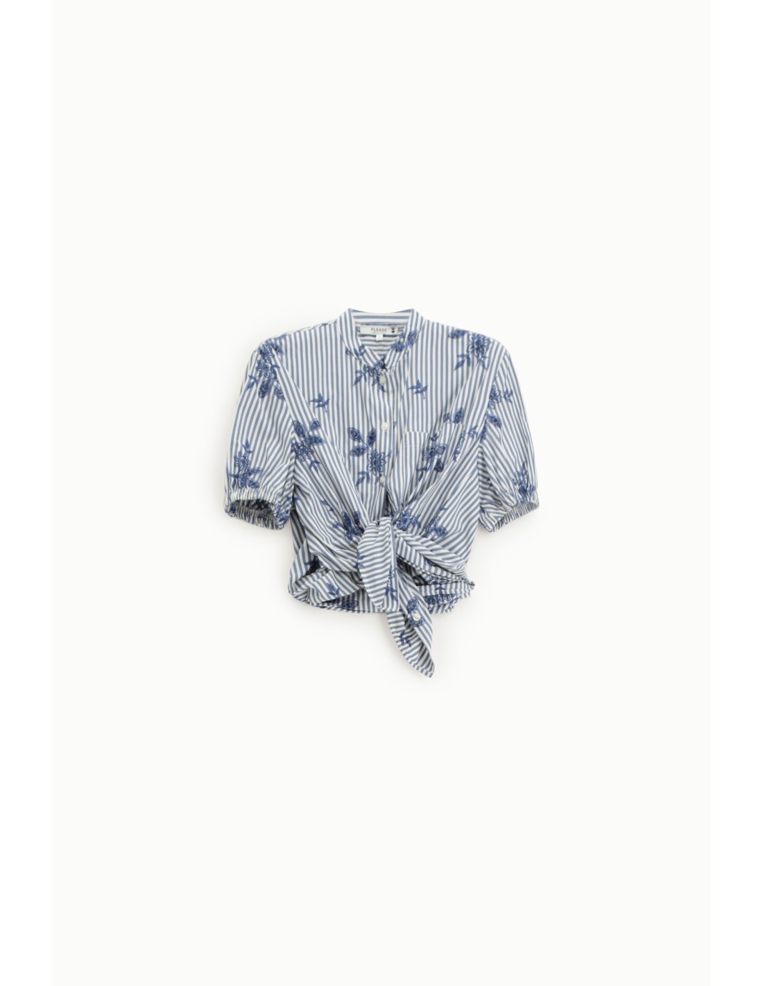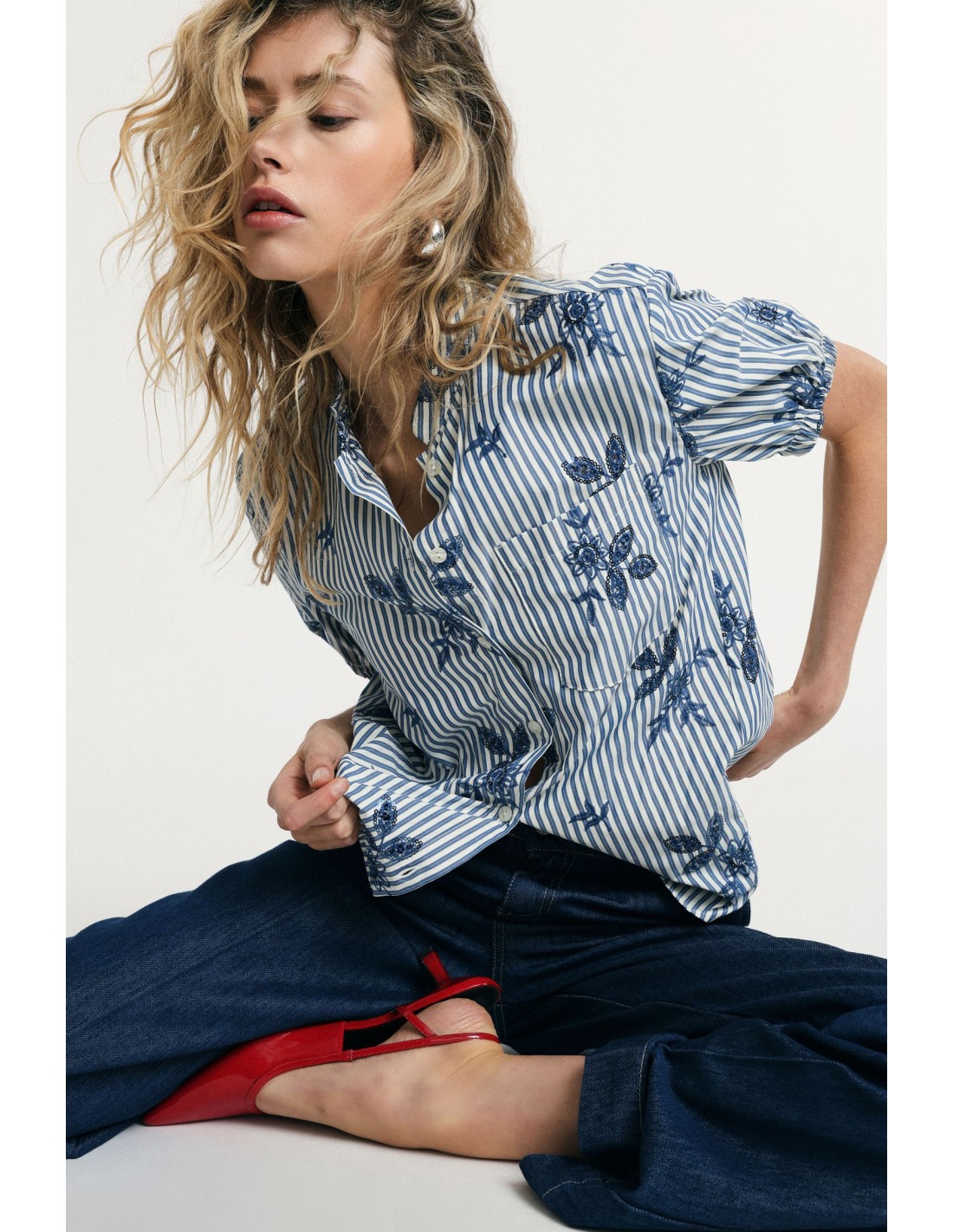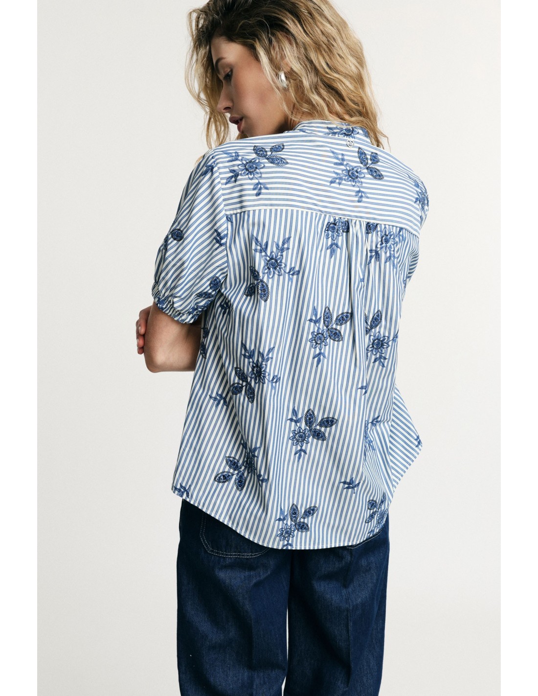 A camisa apresenta um corte descontraído com mangas curtas franzidas e fecho frontal com botões. As riscas verticais são animadas por bordados florais estilizados, para um estilo vibrante que se adapta aos compromissos do dia. Perfeita para usar tanto atada como solta sobre jeans ou calças largas.