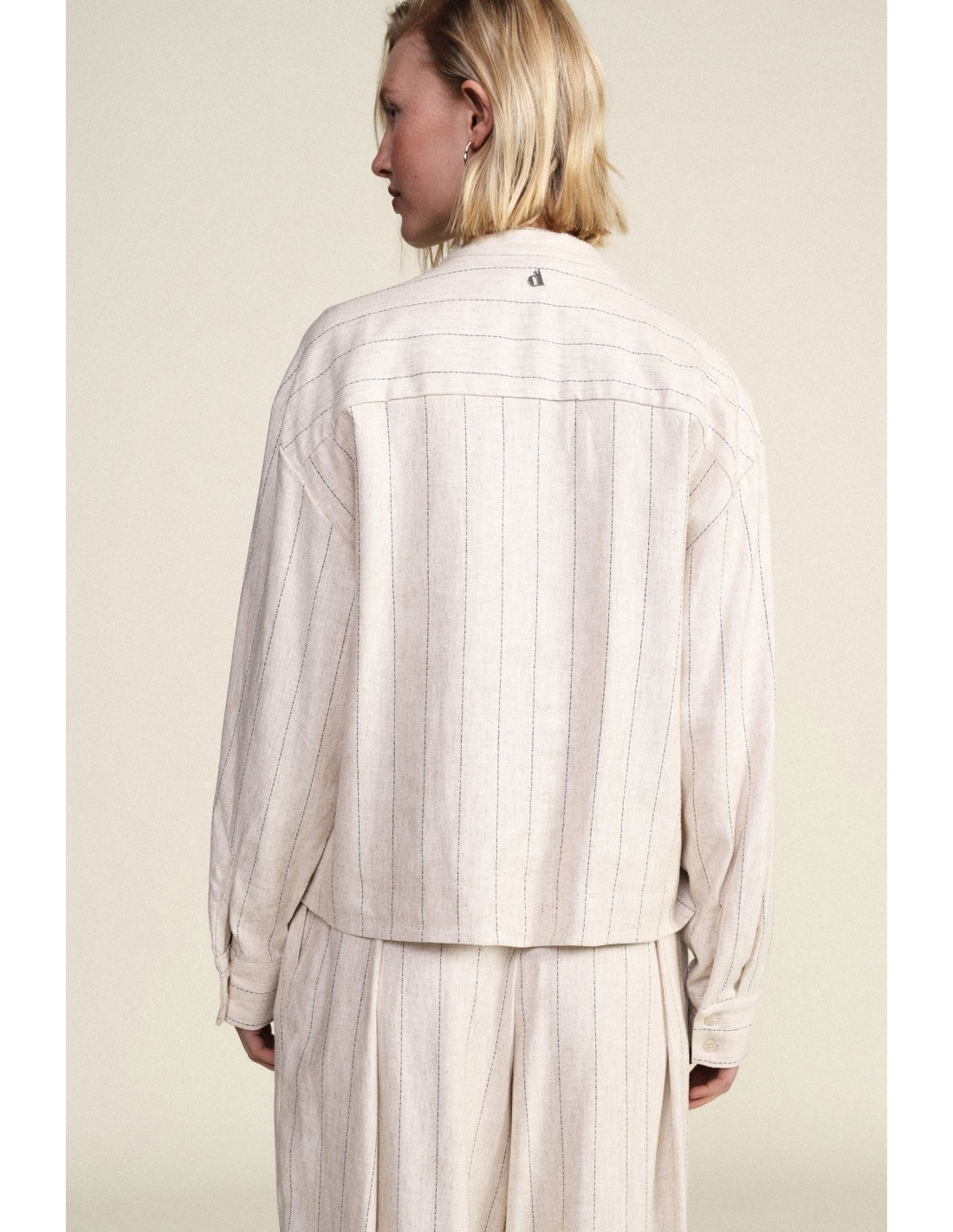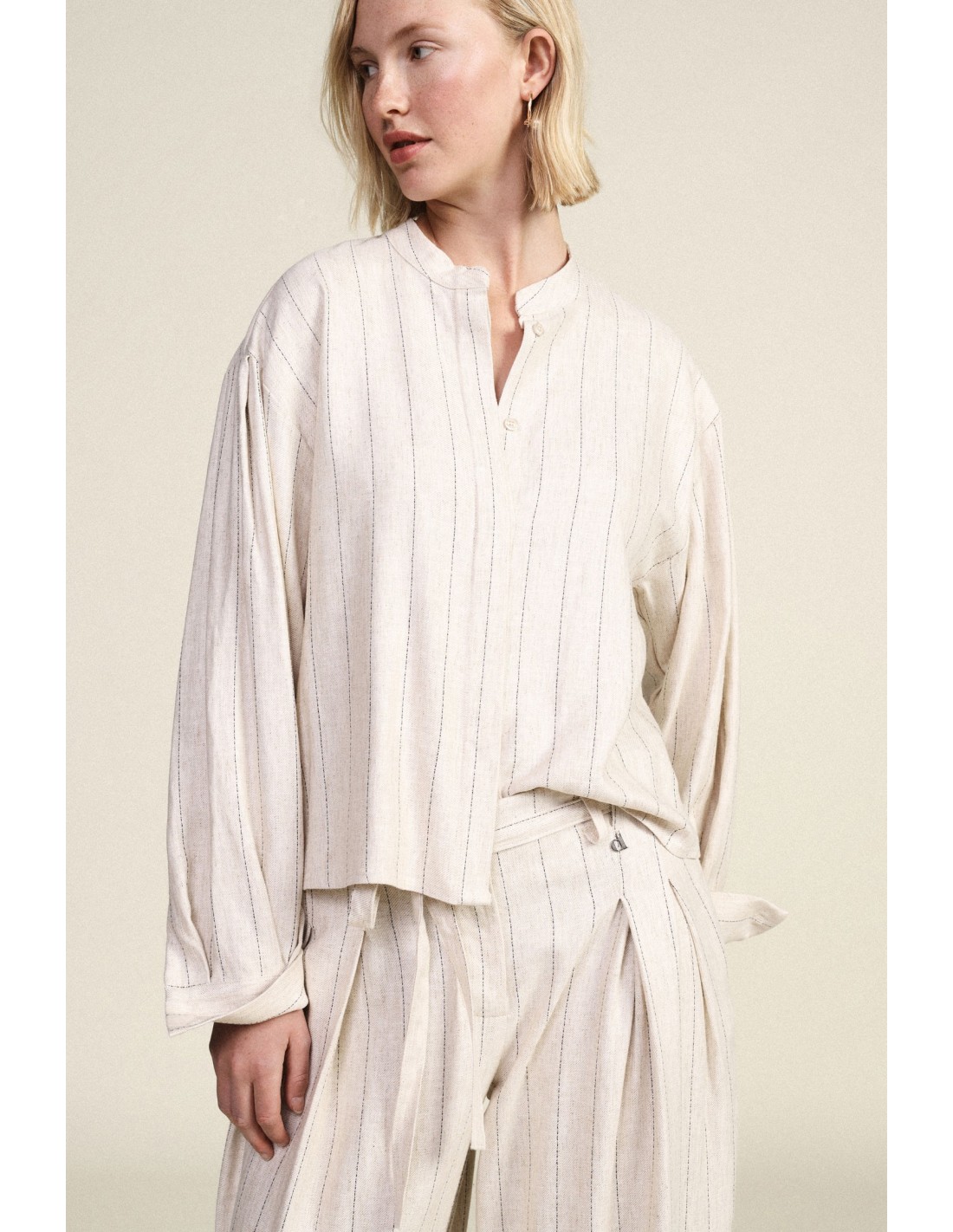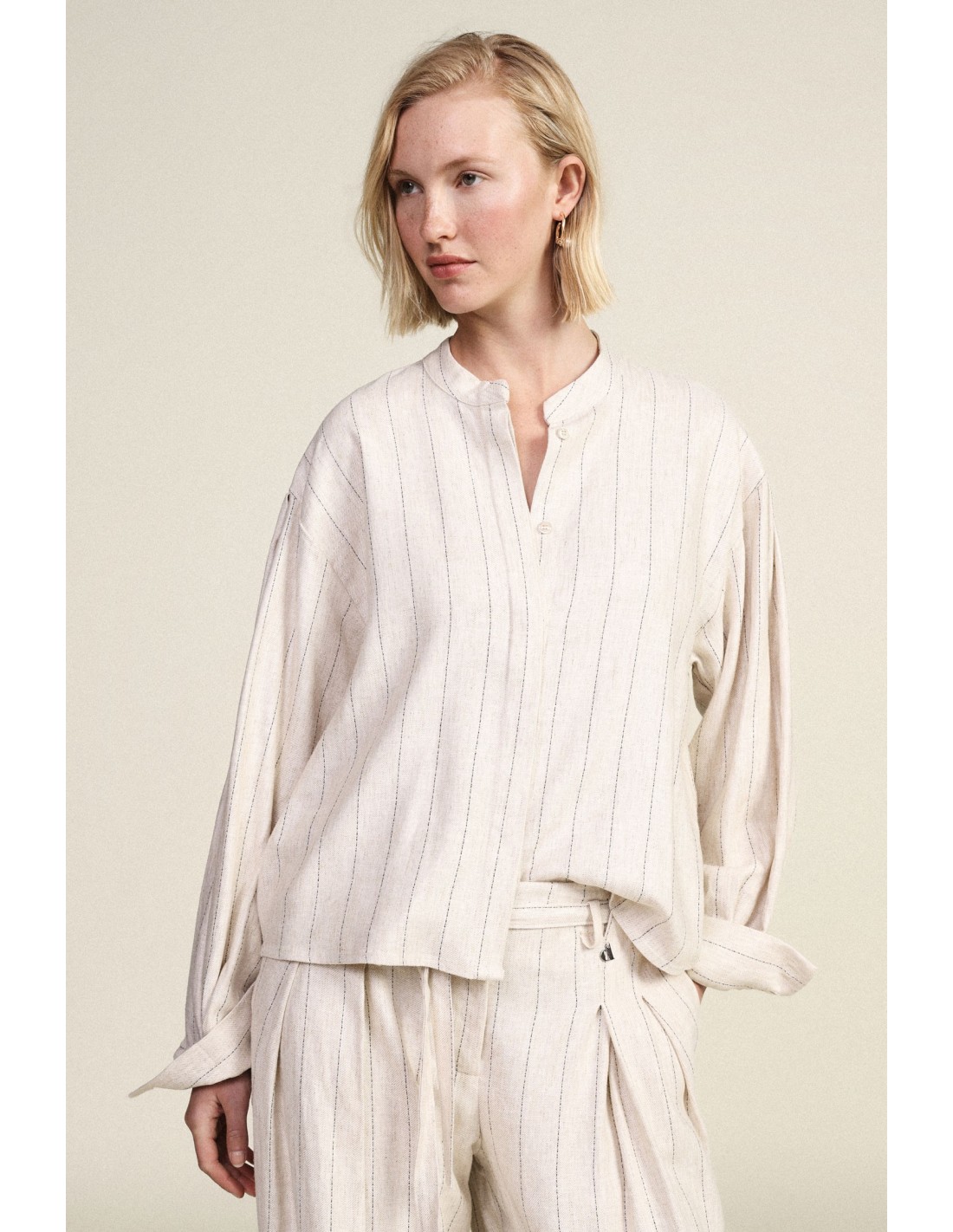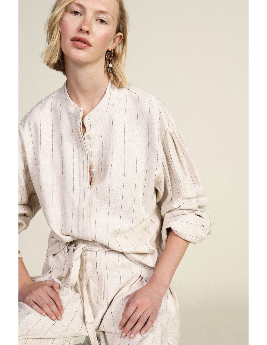 Esta camisa de corte solto conquista à primeira vista graças ao seu padrão de riscas finas e colarinho arredondado. As mangas compridas com punhos conferem um toque refinado e o corte leve torna-a perfeita para qualquer momento do dia, do trabalho a um passeio ao ar livre.