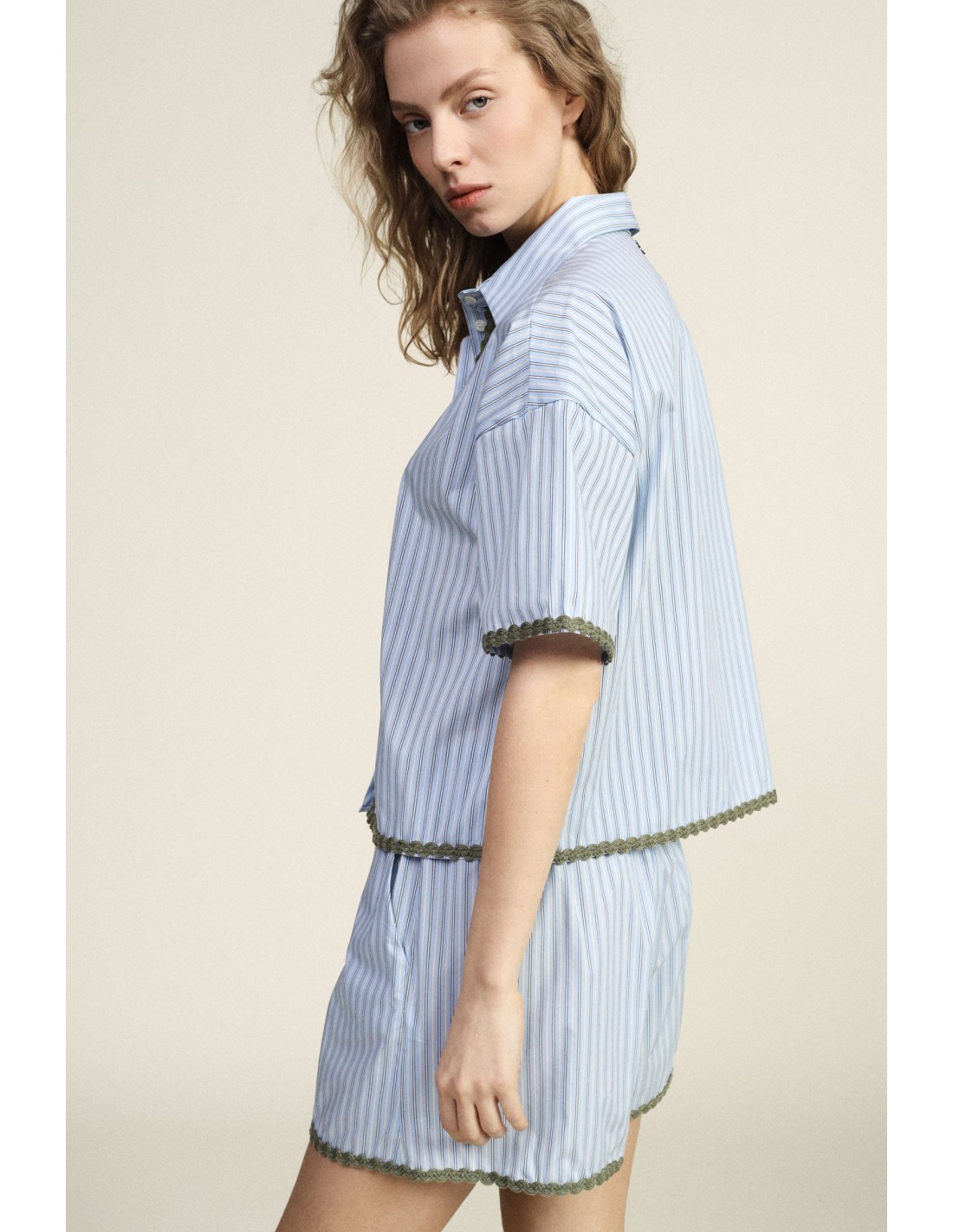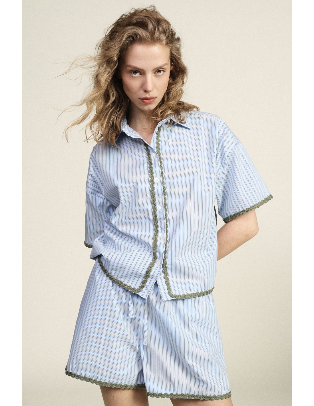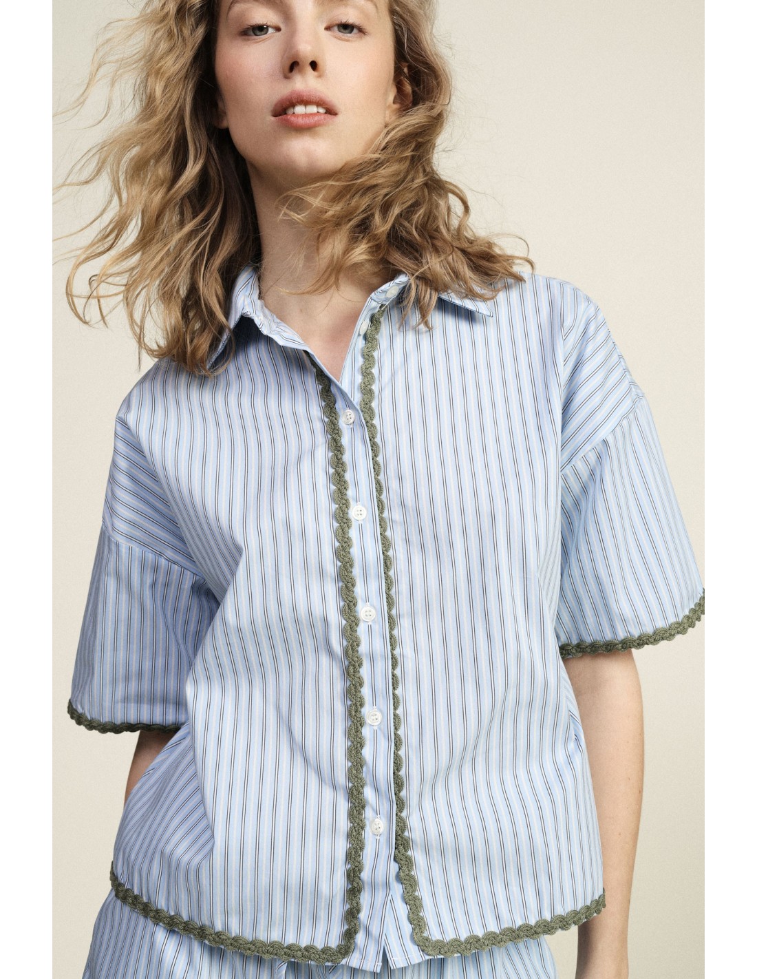 Esta camisa às riscas de corte solto conquista pela sua linha descontraída e pelos detalhes requintados, como os acabamentos picotados em contraste nas mangas, na bainha e na abertura de botões. O colarinho clássico e as mangas curtas tornam-na ideal para os dias mais quentes, perfeita para usar tanto dentro como fora de casa, trazendo um toque de frescura e originalidade.