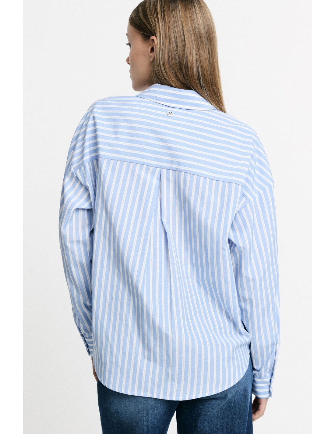 Camisa às riscas de corte solto, perfeita para adicionar um toque fresco ao guarda‑roupa do dia a dia. Apresenta um bolso aplicado enriquecido com detalhes vazados e fecho com botões. As mangas compridas com punhos reguláveis tornam este modelo versátil e prático para looks urbanos e descontraídos.