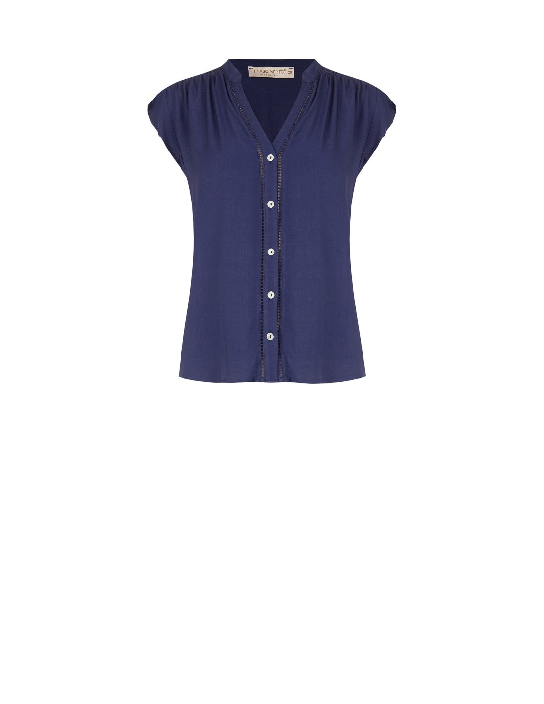 Blusa de corte suave e fluido, em viscose leve com textura fluida que acaricia a silhueta com conforto. O decote em V e o fecho com botões, acabados com delicados inserções perfuradas, tornam-na versátil e feminina: perfeita no escritório e no dia a dia.