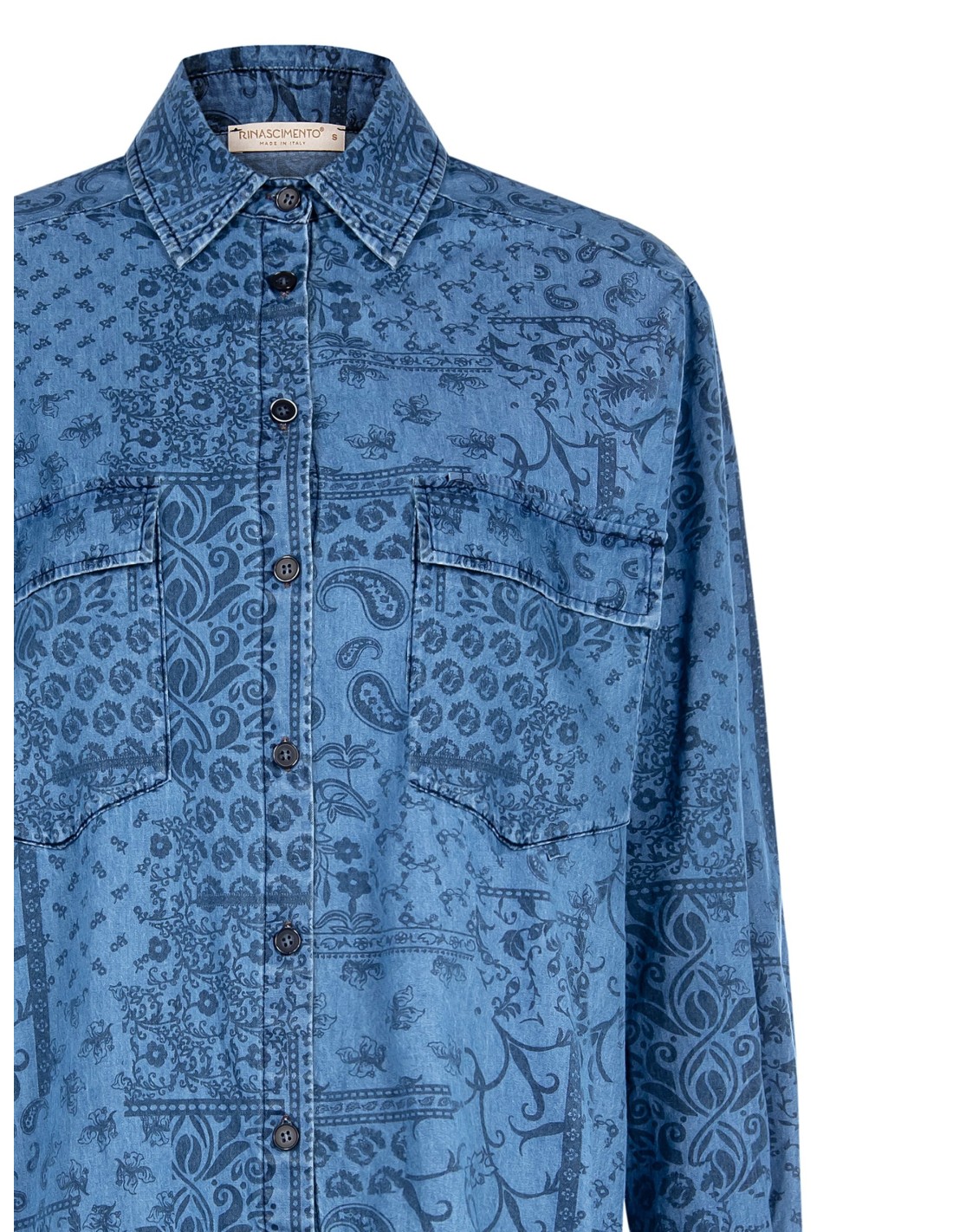 Camisa Ampla Longa Em Ganga Leve Estampada Com Maxi Bolsos Rinascimento