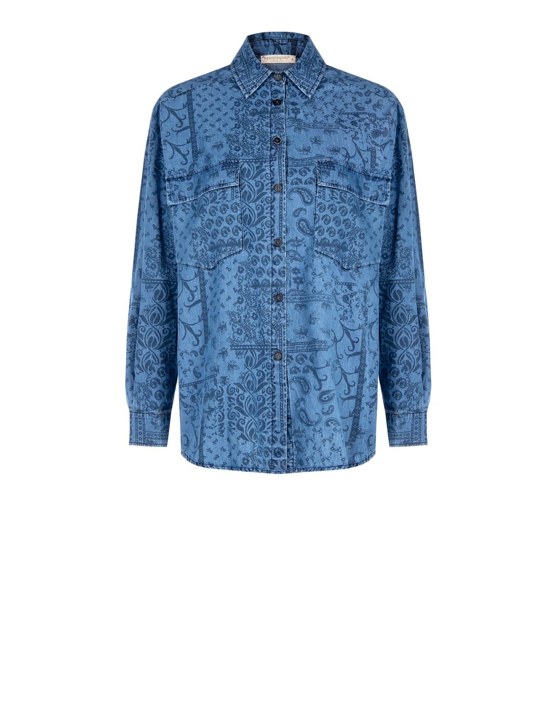 Linha suave e corte relaxado para um modelo em denim leve com textura fluida, enriquecido com estampa paisley e maxi bolsos com pala. O colarinho clássico e o fecho com botões definem a silhueta com naturalidade: perfeito para escritório, tempo livre e looks urbanos do dia a dia.