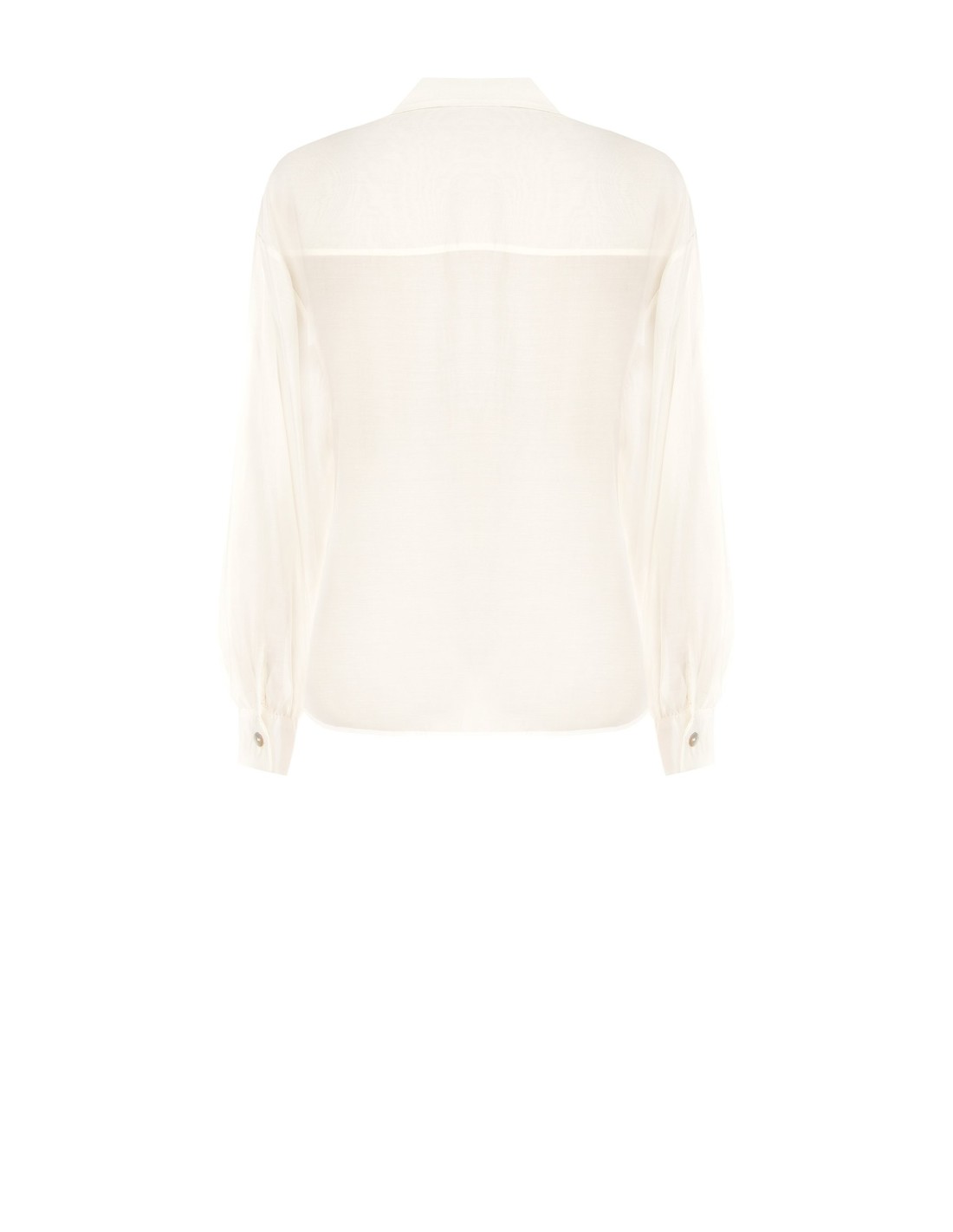 Blusa com caimento macio e fluido, em tecido leve de textura semitransparente que acaricia a silhueta com conforto. A gola clássica, o fecho frontal com botões e os bolsos aplicados tornam-na versátil e refinada, perfeita do escritório ao dia a dia com um toque feminino.