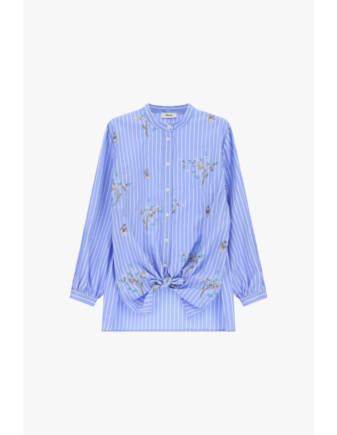 Deixe-se surpreender por esta camisa com padrão às riscas e delicados bordados florais. A gola à coreana e as mangas compridas com punho conferem um toque original, perfeita para usar todos os dias para acrescentar carácter e leveza ao seu look. Fácil de combinar e ideal para quem gosta de se destacar com detalhes refinados.