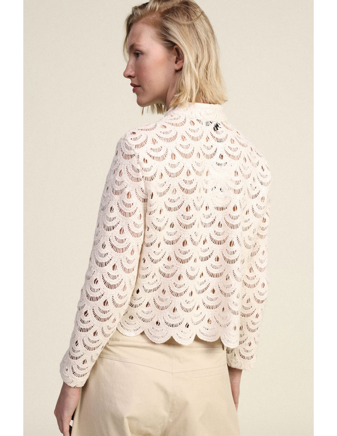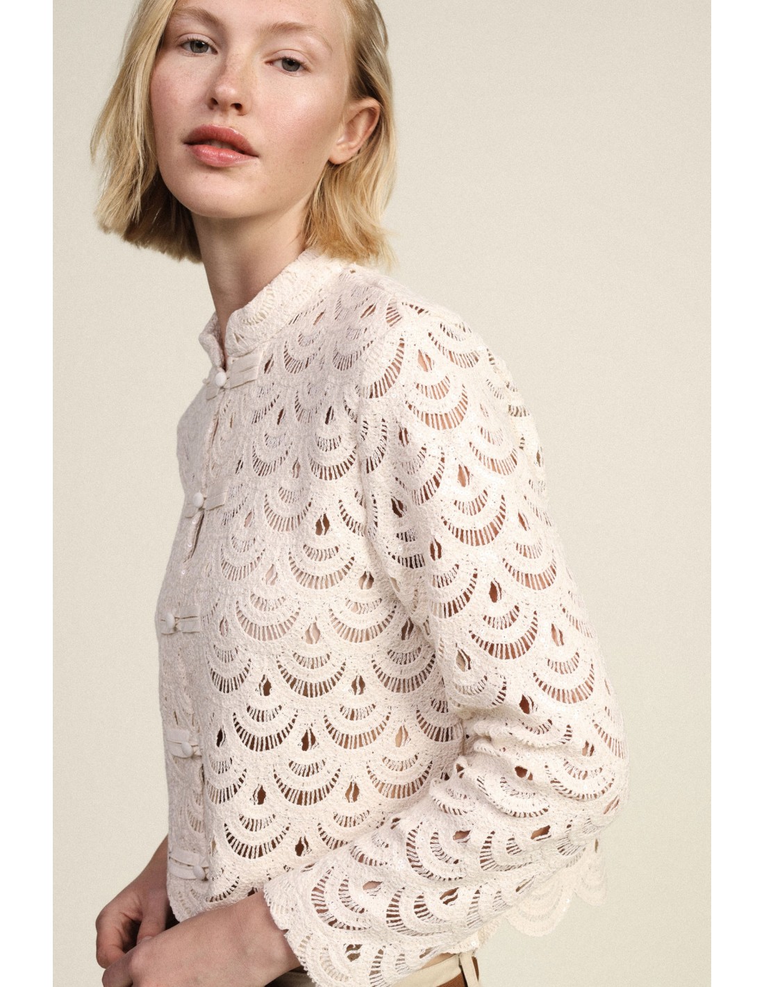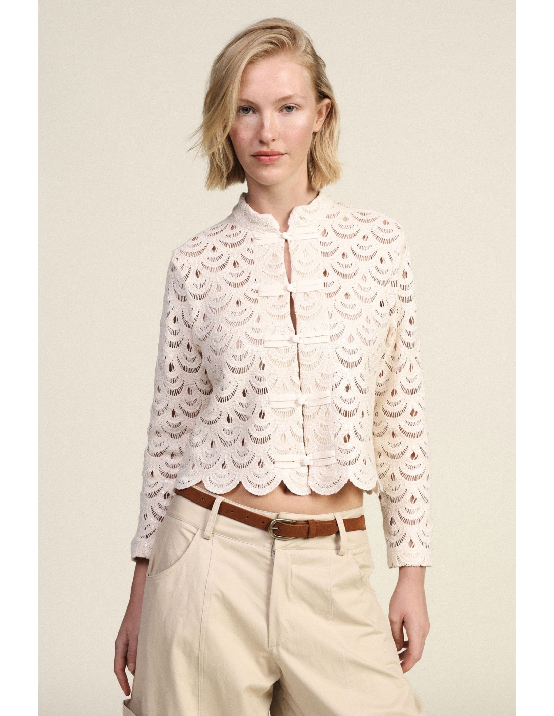 Torna cada dia especial com esta camisa em renda de corte curto, enriquecida com acabamentos festoneados e fecho frontal com botões de nó. Perfeita para quem gosta de pormenores requintados e de um estilo feminino, combina facilmente tanto com jeans como com uma saia, realçando a tua personalidade em todas as ocasiões.