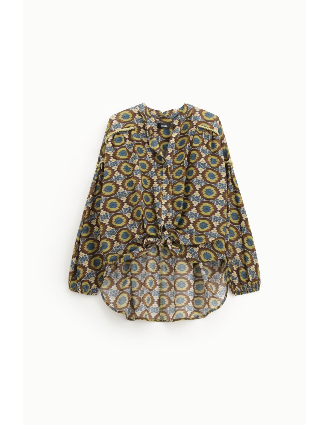 Uma camisa fluida e leve, perfeita para quem gosta de conforto e estilo numa só peça. O seu design cativante, com um motivo geométrico vibrante, confere carácter a qualquer look. A bainha assimétrica e as mangas elásticas acrescentam praticidade no dia a dia, tornando-a ideal para várias ocasiões.