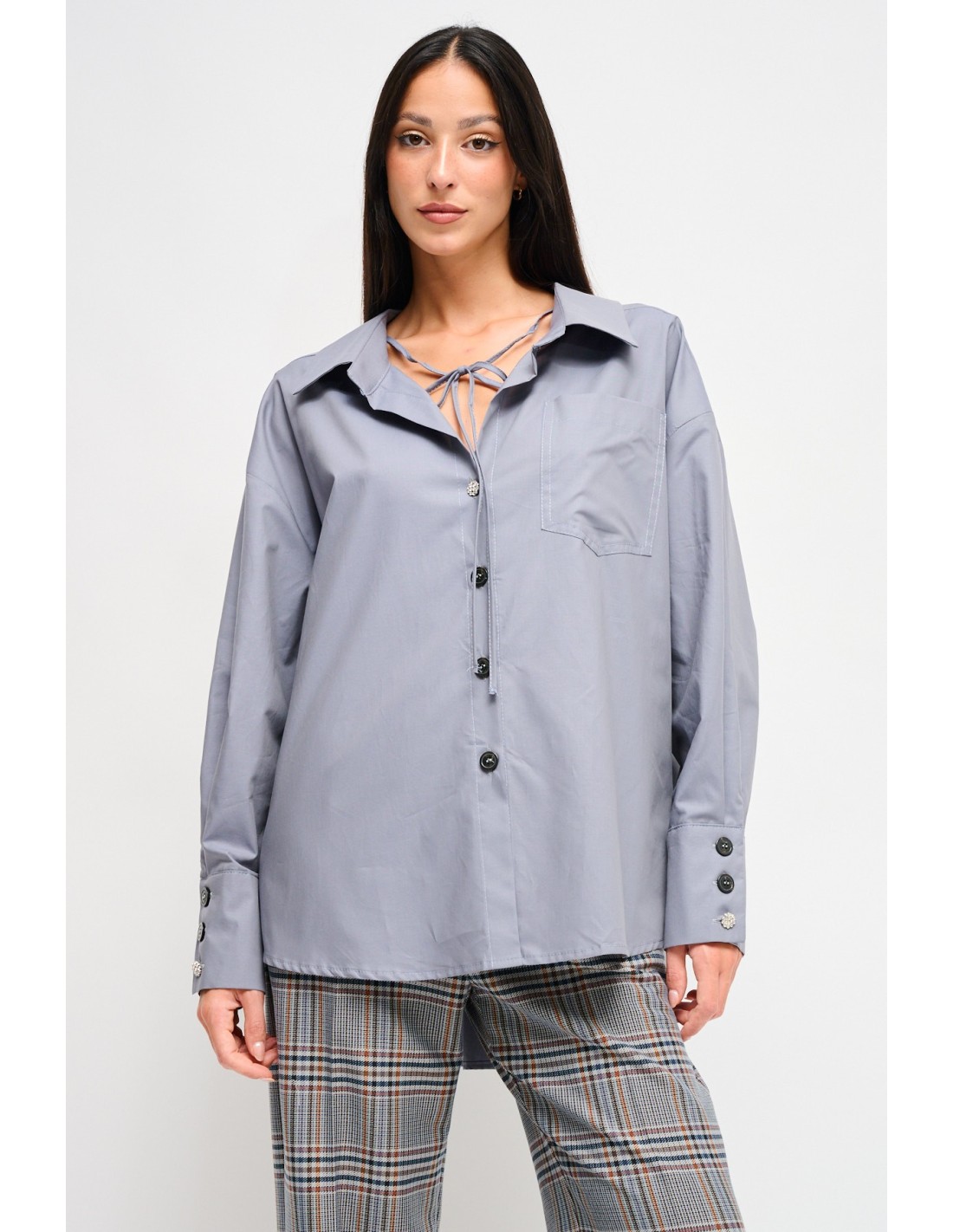 Esta camisa oversize de design limpo é enriquecida com um laço ao pescoço ajustável e um botão joia que personalizam o seu estilo. O corte relaxado torna-a perfeita para um look casual chic ou um outfit em camadas e na moda.