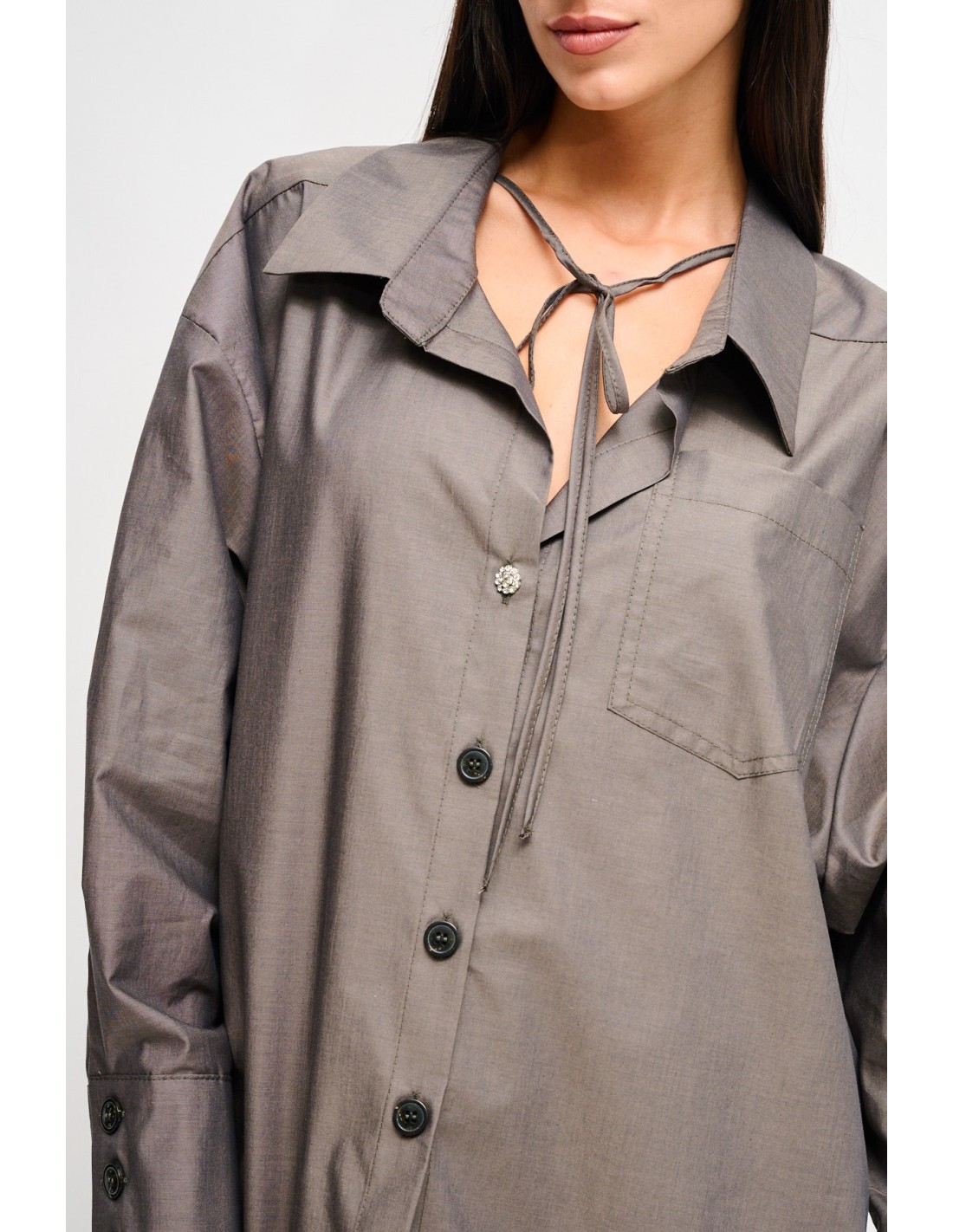 Esta camisa oversize de design limpo é enriquecida com um laço ao pescoço ajustável e um botão joia que personalizam o seu estilo. O corte relaxado torna-a perfeita para um look casual chic ou um outfit em camadas e na moda.