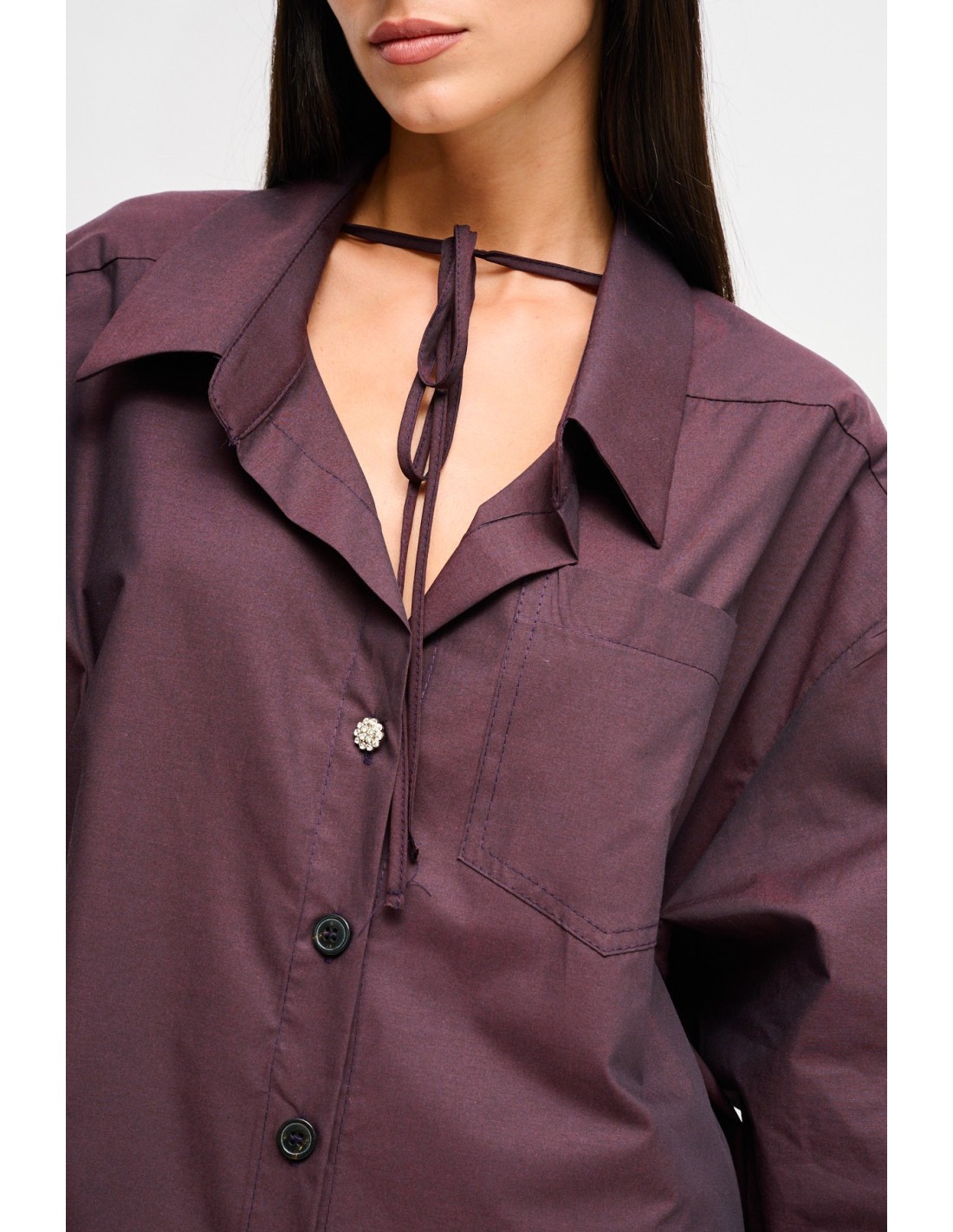 Esta camisa oversize de design limpo é enriquecida com um laço ao pescoço ajustável e um botão joia que personalizam o seu estilo. O corte relaxado torna-a perfeita para um look casual chic ou um outfit em camadas e na moda.