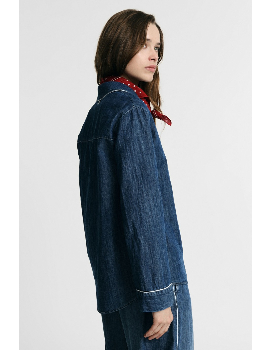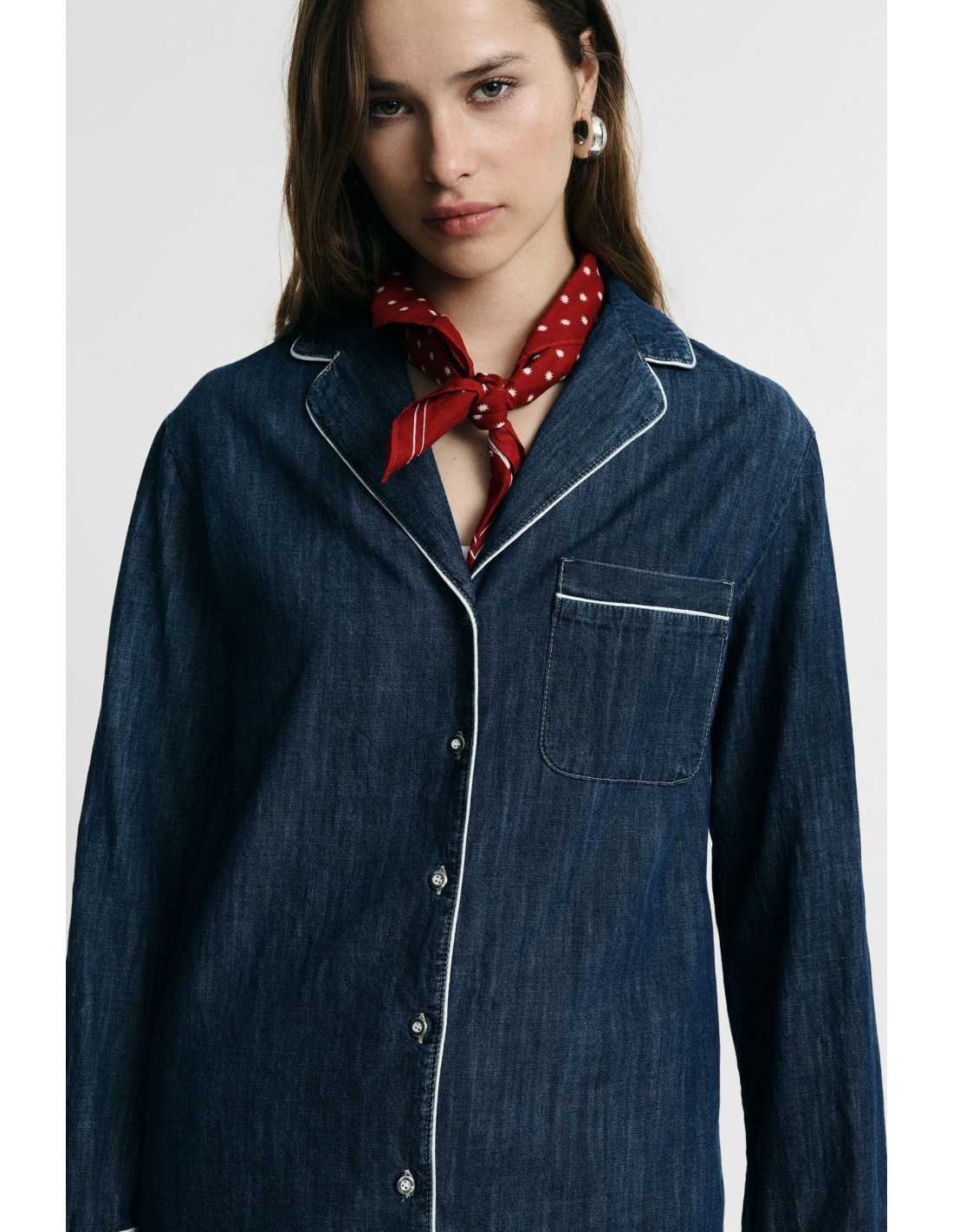 Camisa com corte regular-fit, fecho com botões à frente e detalhes piping em contraste na gola, punhos e bolso único. Perfeita para criar looks versáteis e casuais, para usar aberta ou fechada, acrescenta personalidade aos outfits do dia a dia e convida a misturar estilos diferentes.