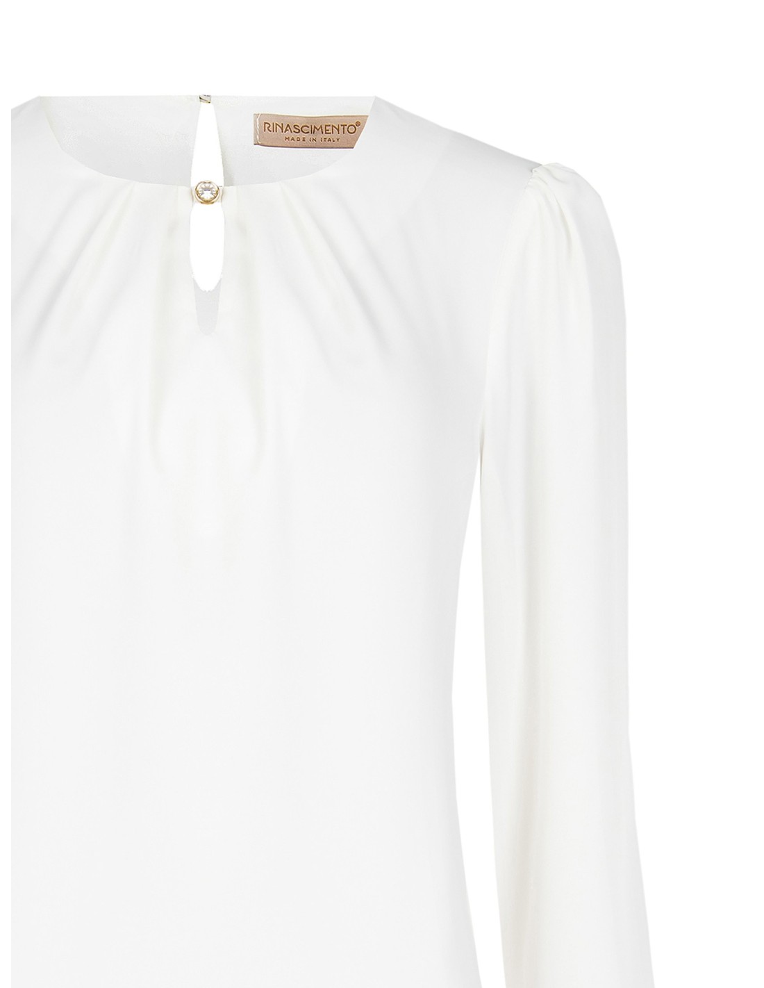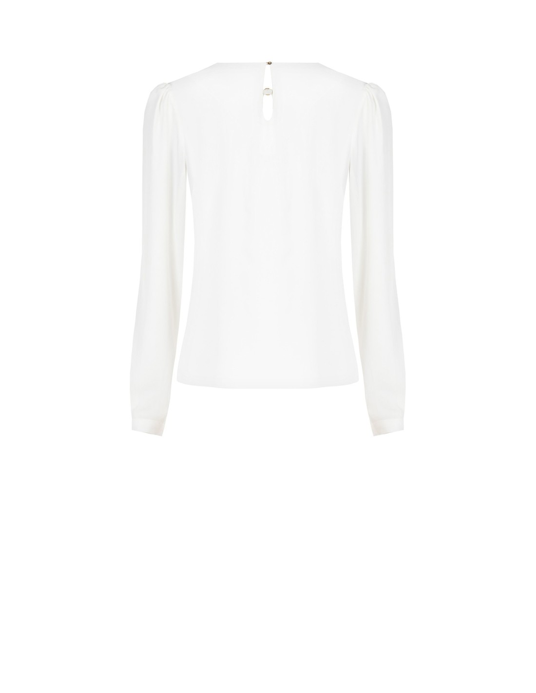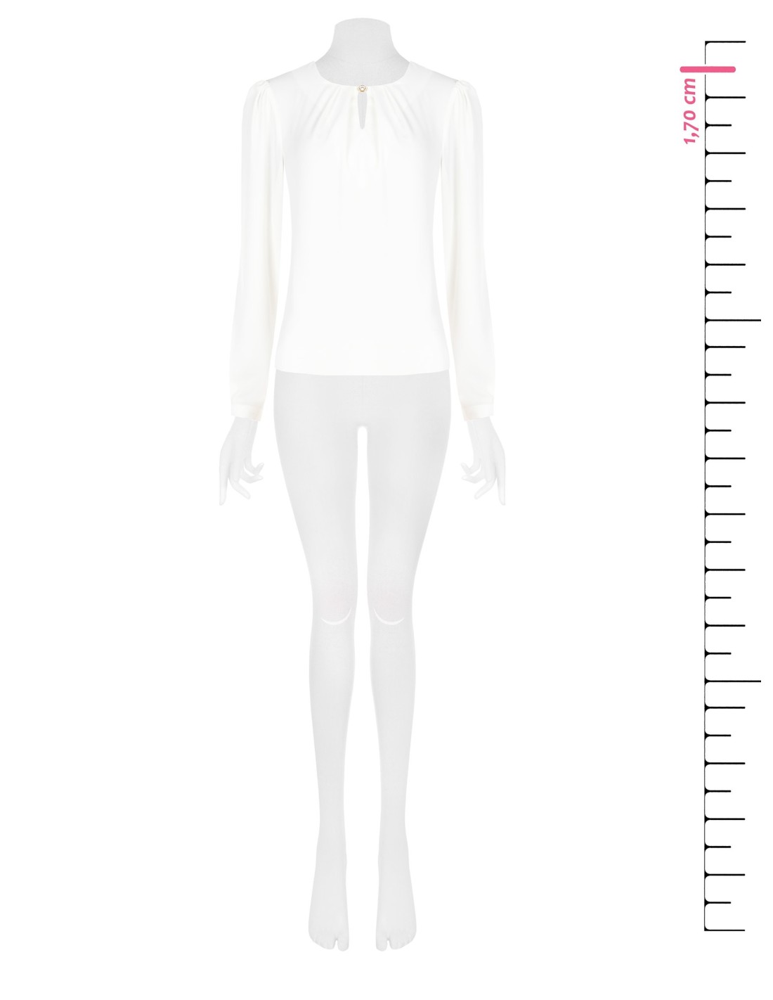 Top fluido de corte reto que acaricia a figura sem marcar, em tecido macio com efeito crepe. O decote redondo com abertura em gota e botão joia ilumina o decote, enquanto as leves pregas nos ombros acrescentam feminilidade. Perfeito para o escritório e saídas elegantes.