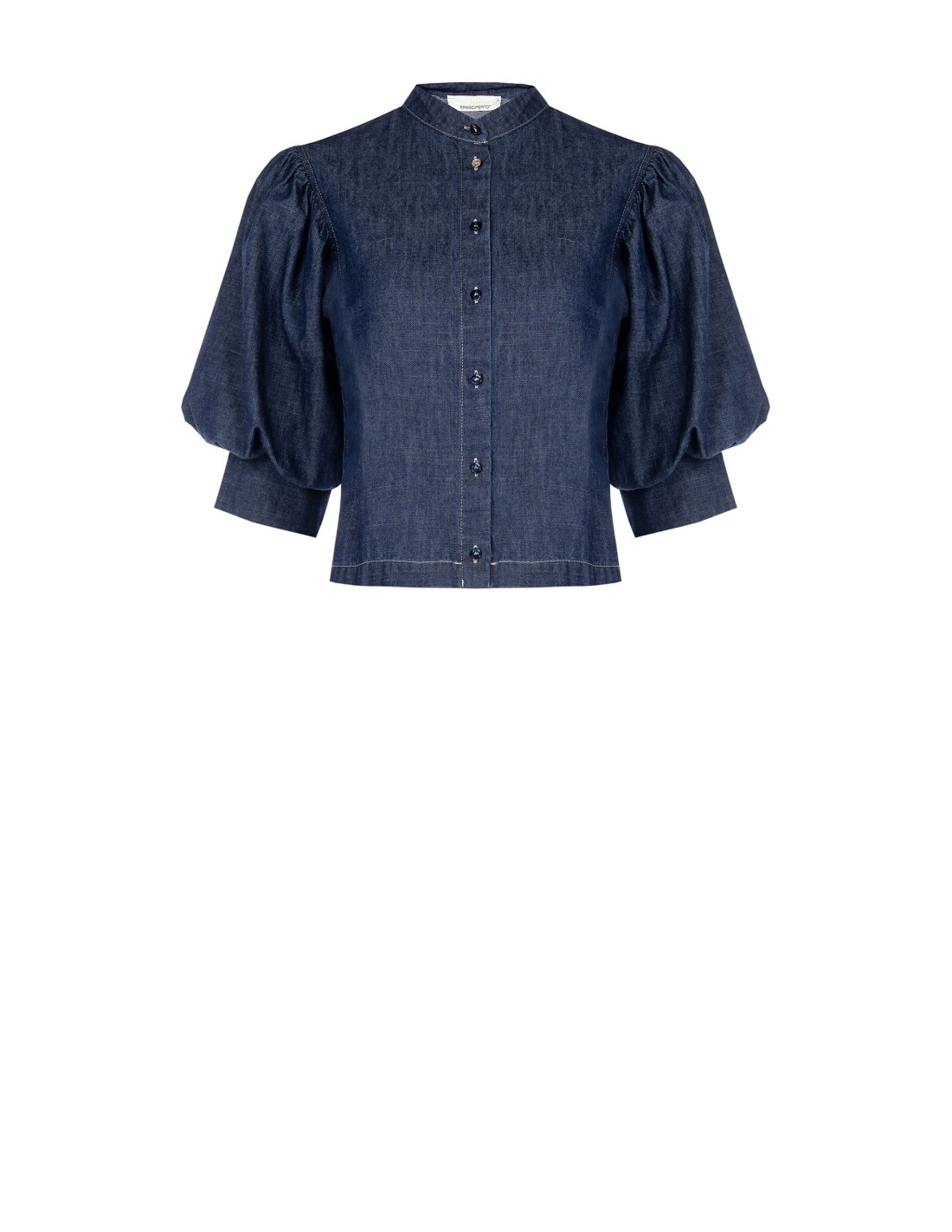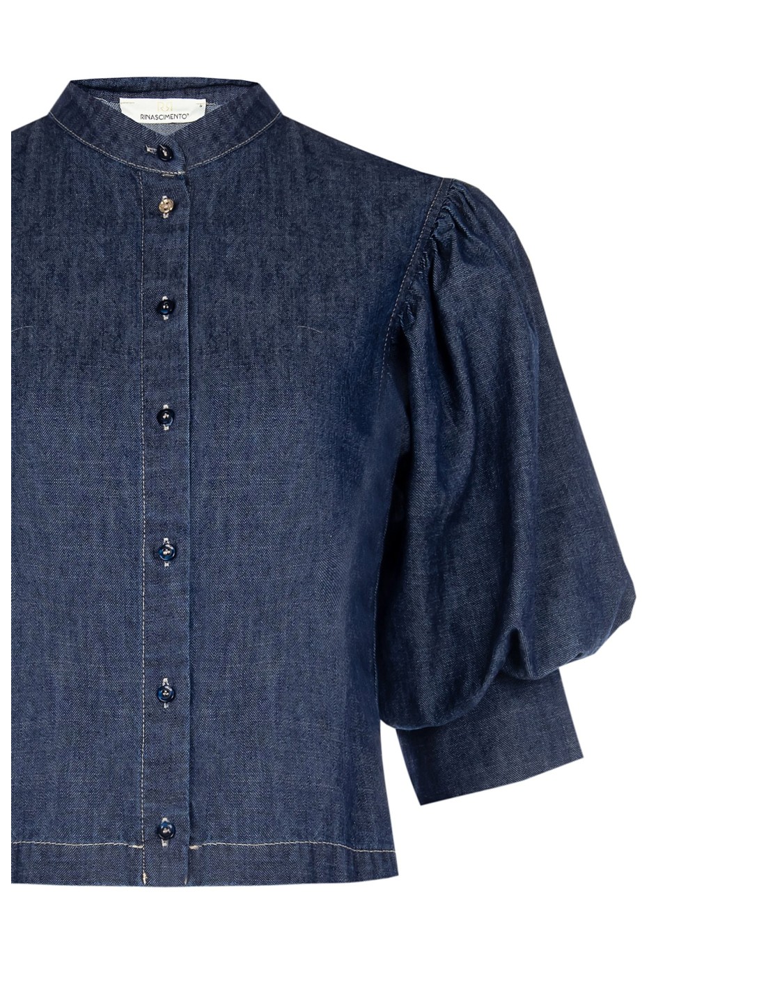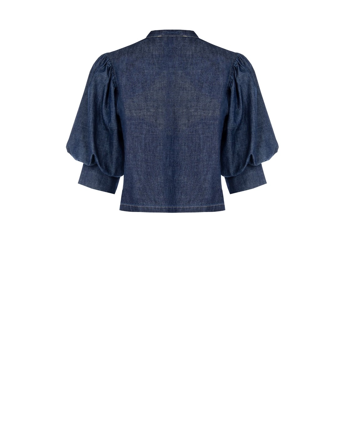 Top em denim leve de corte recto e curto, que valoriza a cintura sem marcar. Mangas bufantes com punho estruturado e gola à coreana com botões frontais. Perfeito com calças ou saias de cintura alta, do escritório ao aperitivo.