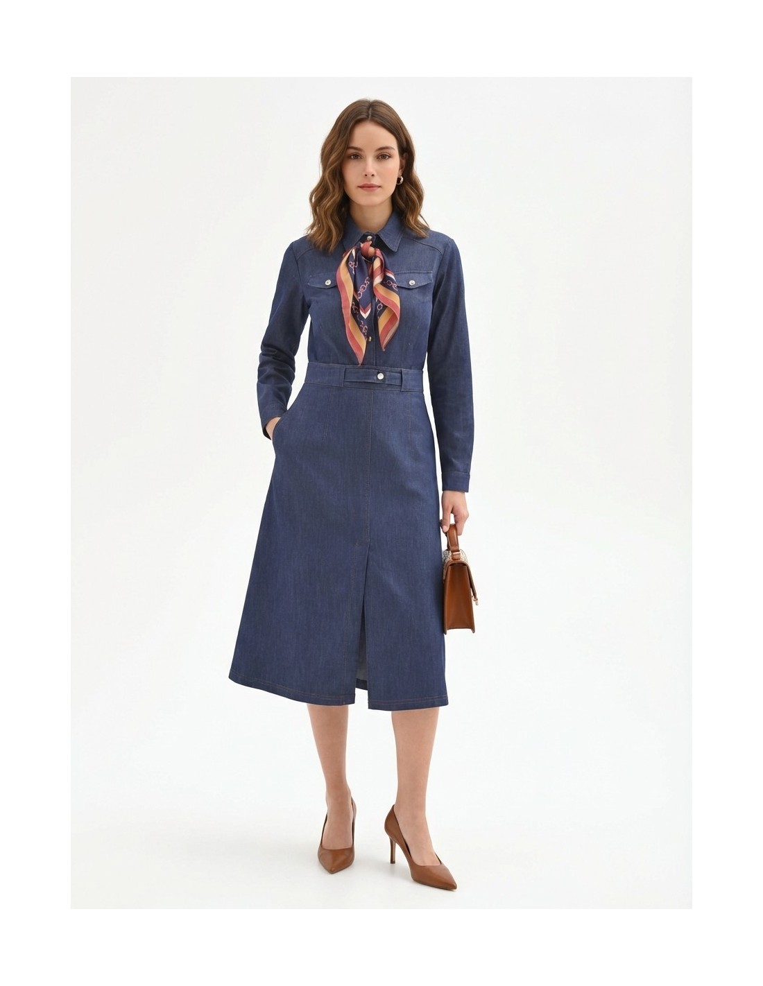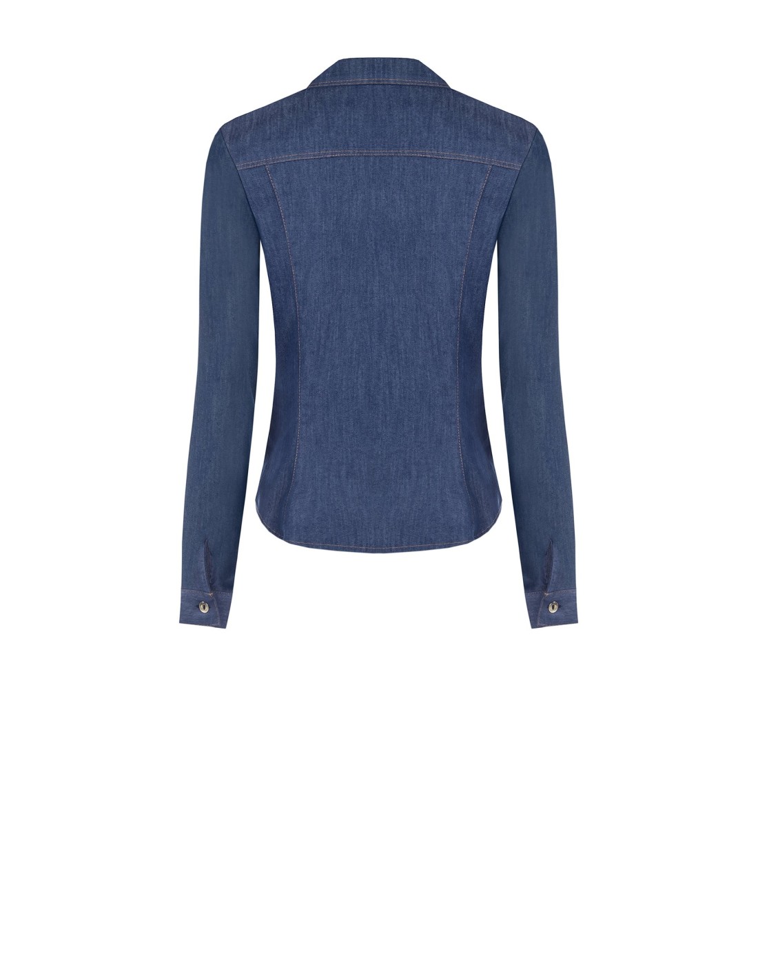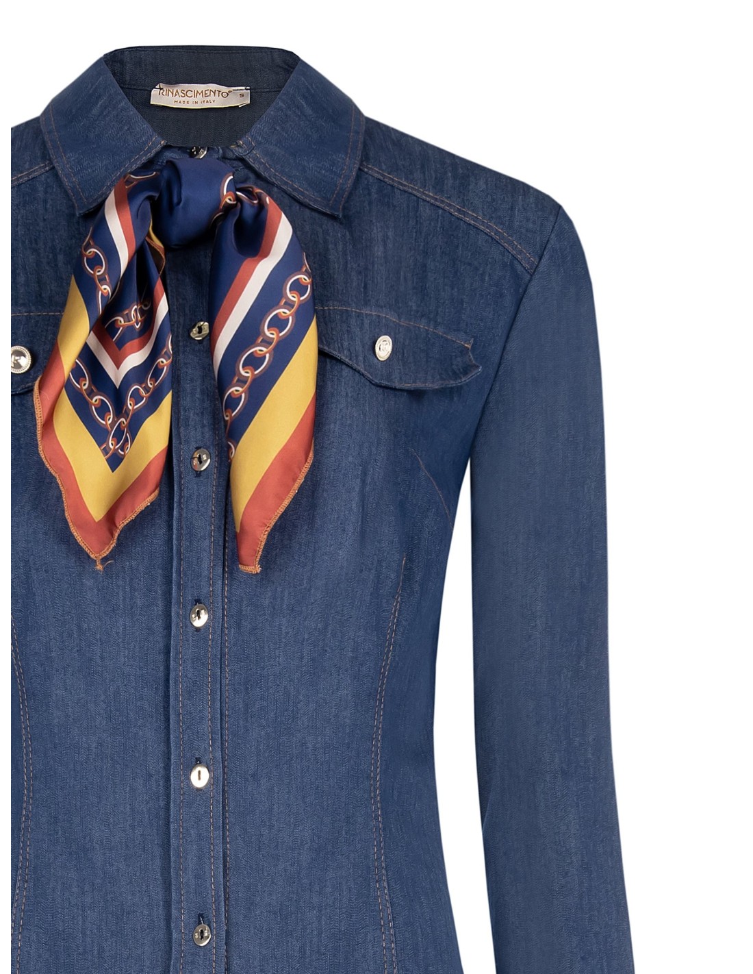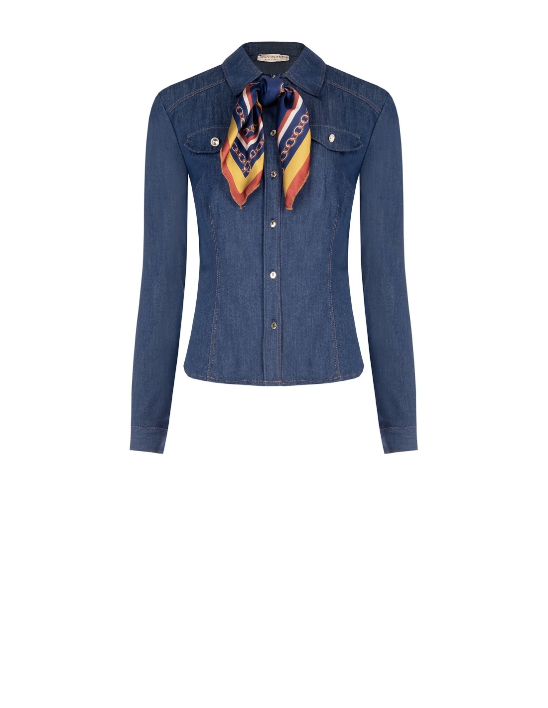 Top em denim stretch com corte justo que esculpe a silhueta com conforto. O fecho com botões metálicos e os bolsos com pala remetem à estética utility, enquanto o lenço estampado no pescoço adiciona um toque chique. Perfeito para o escritório e para o tempo livre.