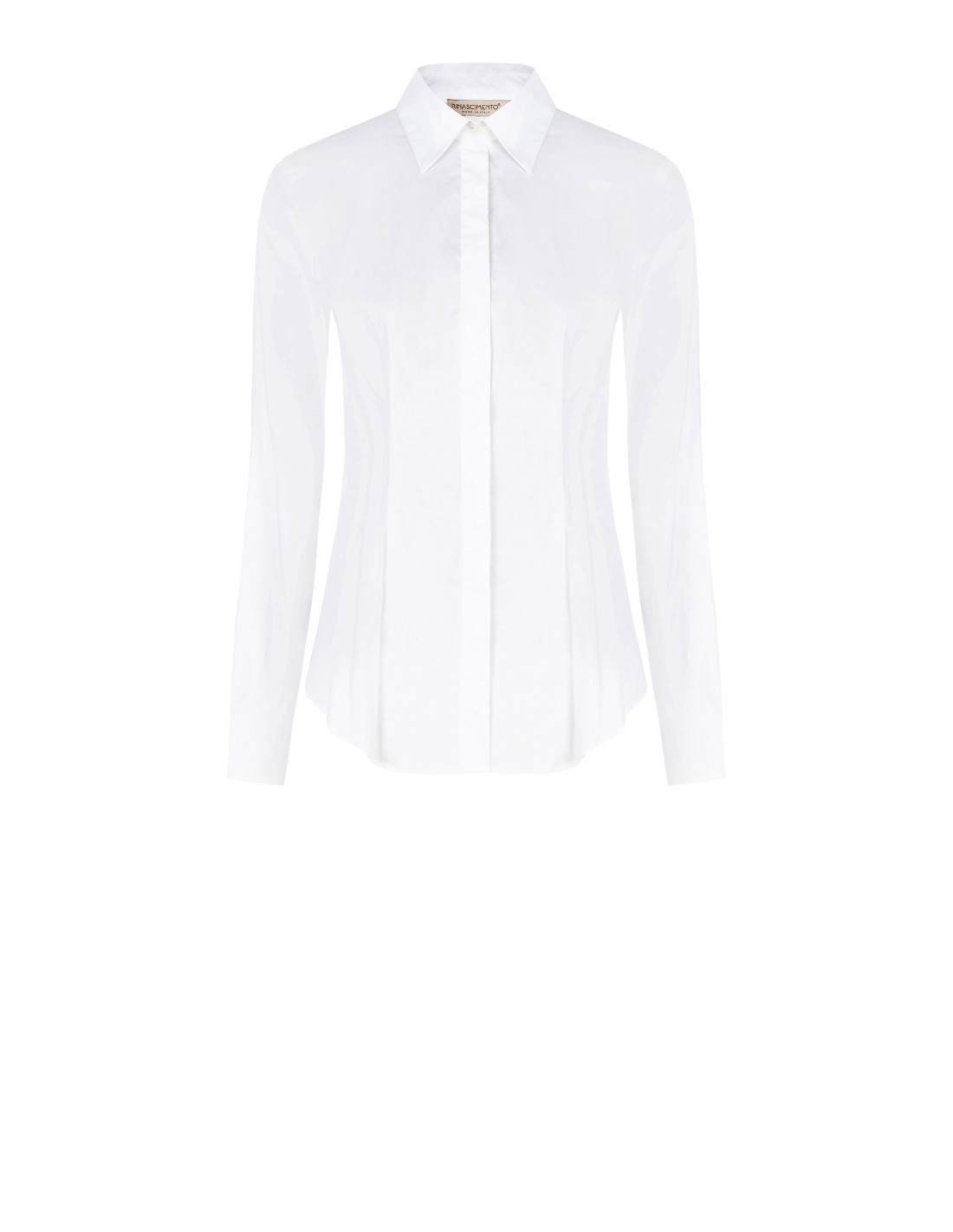 Corte justo que realça a silhueta sem prescindir do conforto, em popelina lisa e ligeiramente stretch. Gola pontiaguda e fecho de botões encoberto conferem uma elegância discreta, enfatizada pelo logo nas costas. Perfeita com tailleur no escritório ou com denim para o dia a dia.