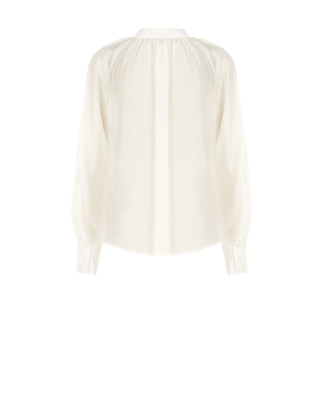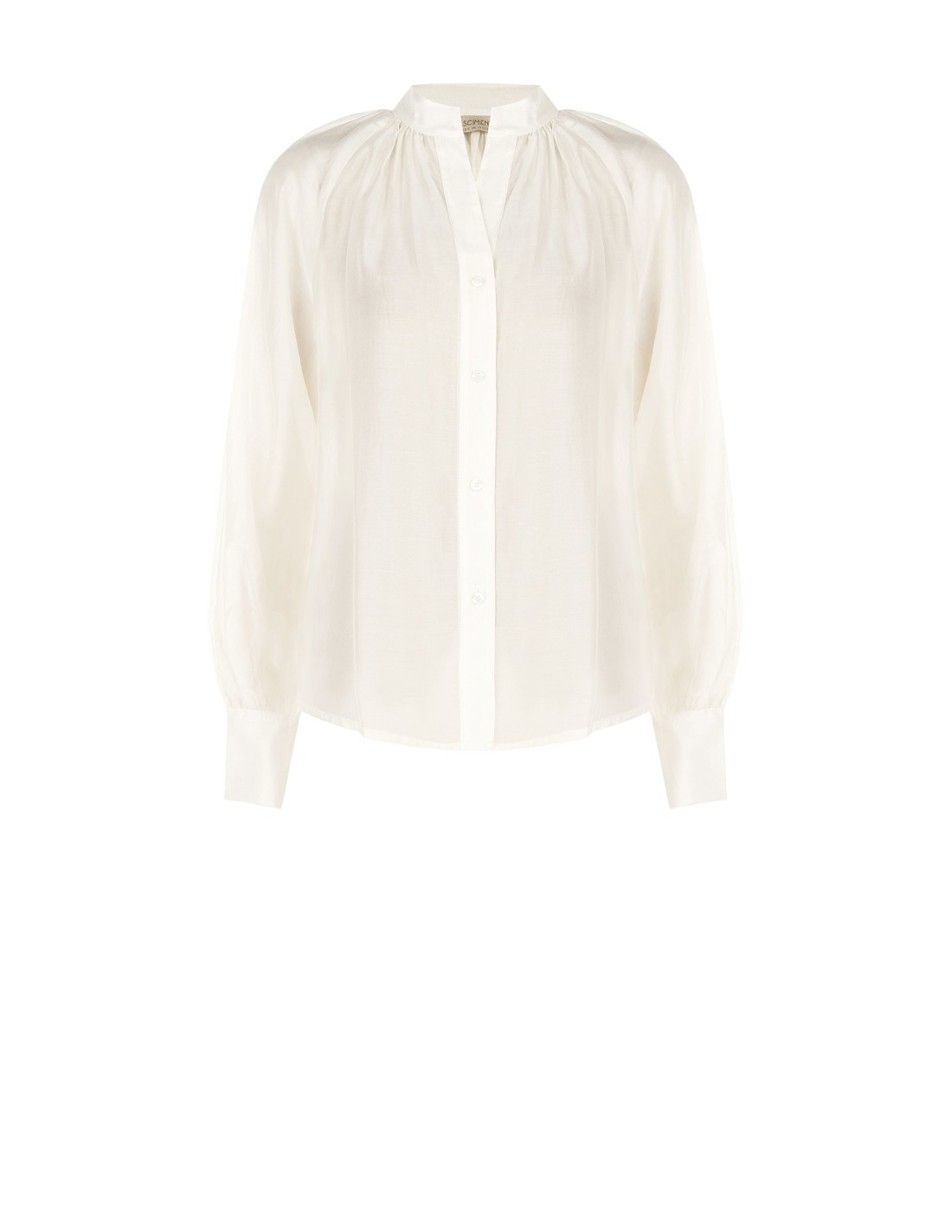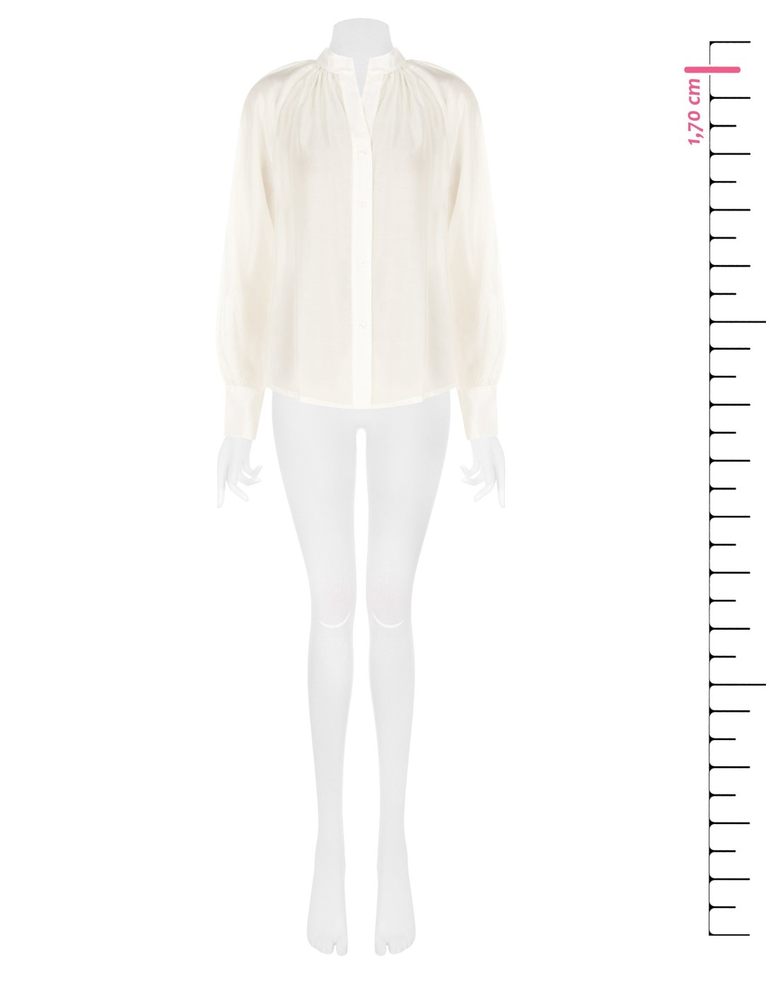 Top fluido de corte macio, em tecido leve e sedoso que acaricia a silhueta com conforto. O colarinho à coreana com abertura em V e os franzidos nos ombros acrescentam feminilidade, enquanto os punhos altos definem o look. Perfeito no escritório e nas ocasiões do dia a dia mais cuidadas.
