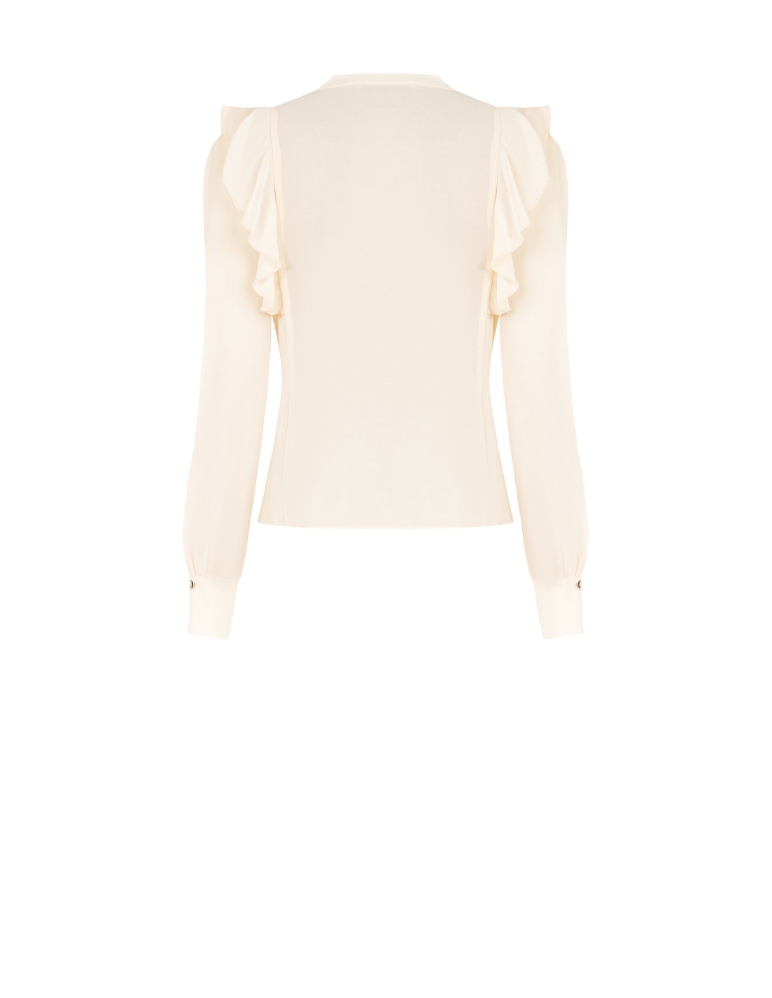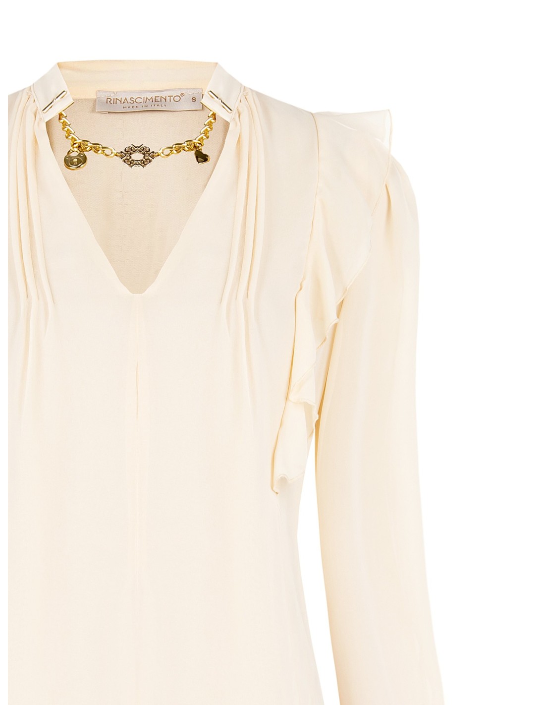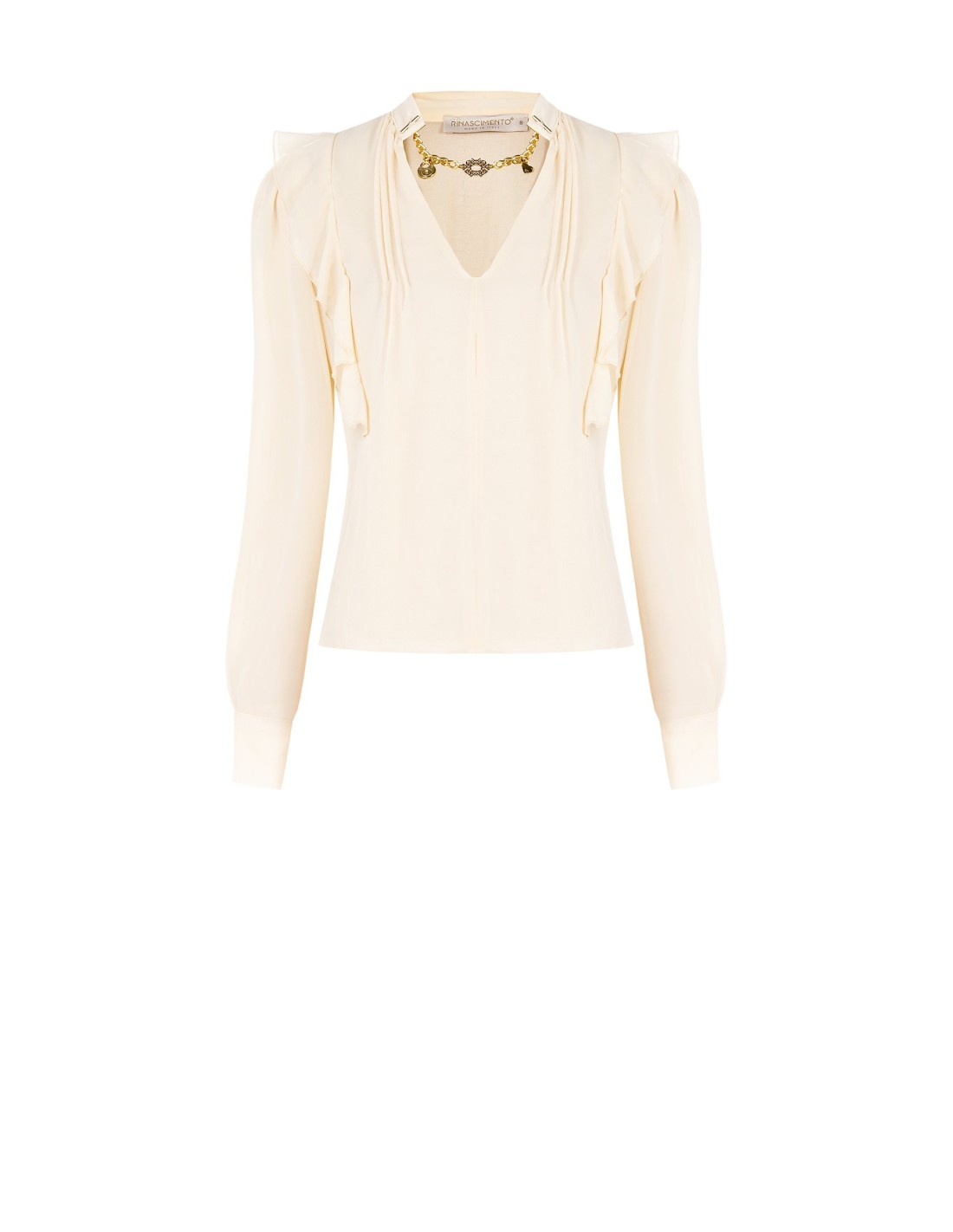 Blusa fluida Rinascimento com um corte ligeiramente evasé que valoriza a silhueta sem apertar. Georgette leve, com ligeiras transparências. Decote em V com corrente-jóia removível e pequenos folhos nos ombros. Perfeita para o escritório com blazer, ideal também para um aperitivo ou encontro para jantar.