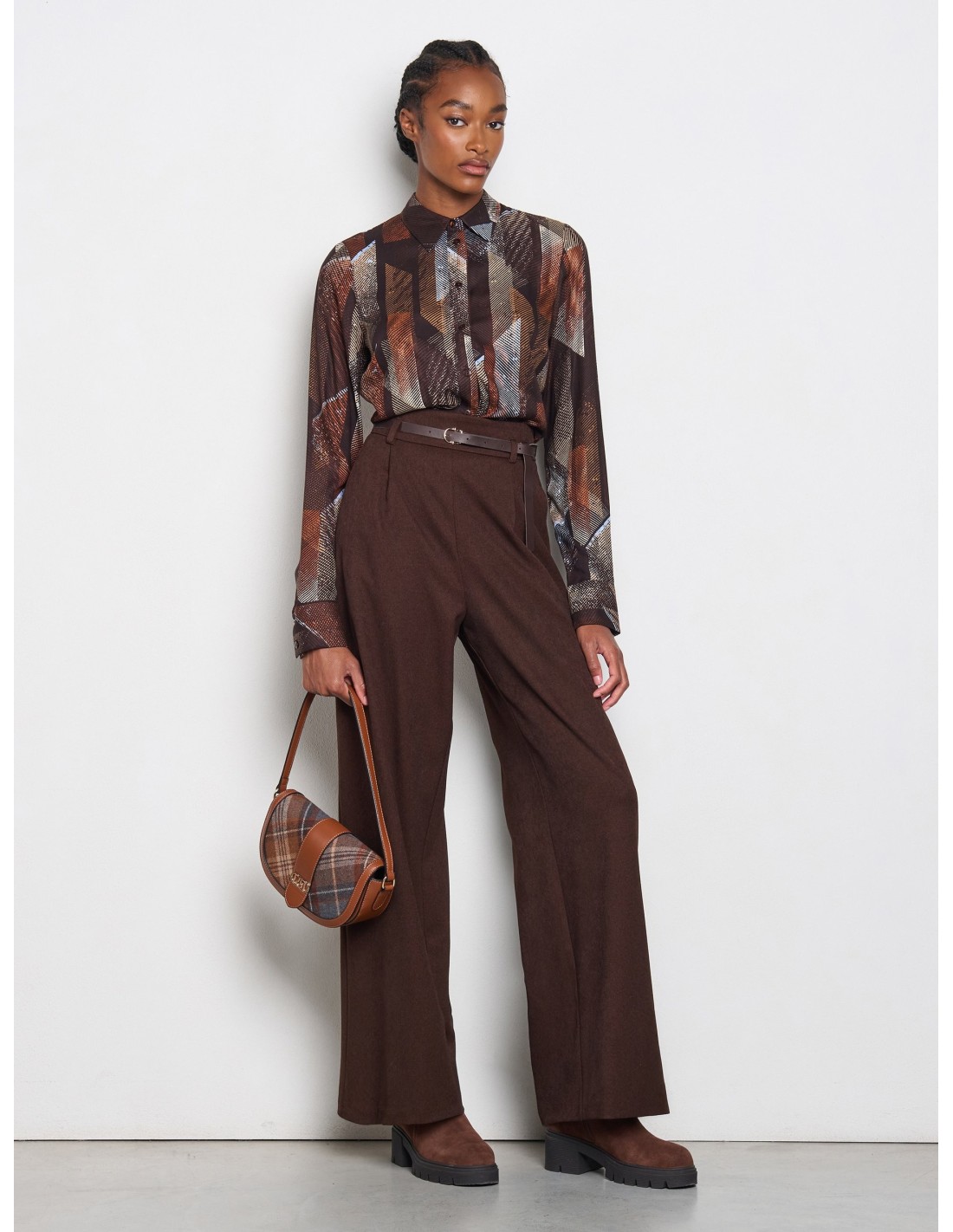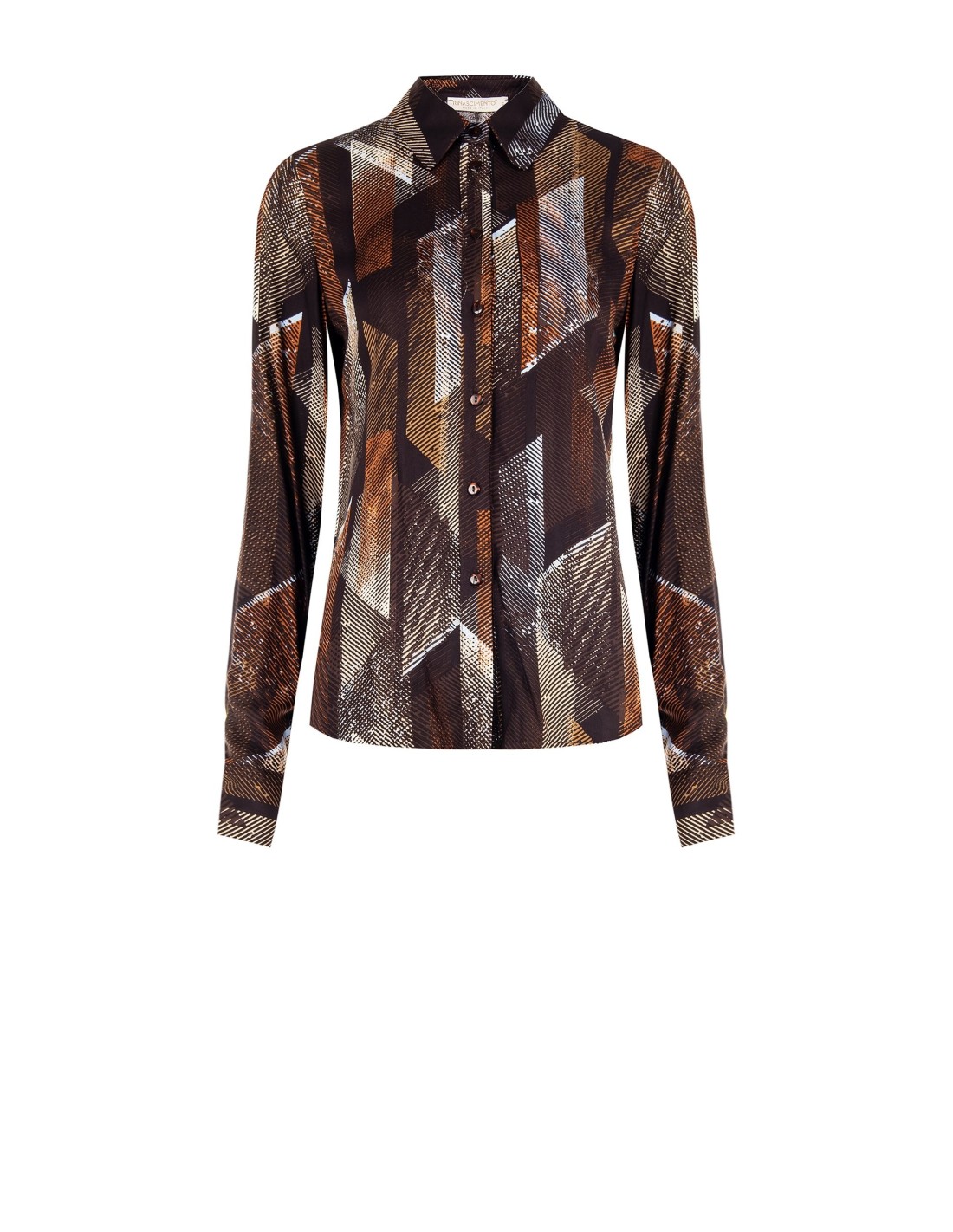 Blusa de corte suave e ligeiramente ajustada, em tecido de viscose fluido e leve que acaricia a silhueta. A estampa gráfica all‑over e a abotoadura frontal com colarinho estruturado acrescentam carácter. Perfeita com calças de alfaiataria para o escritório e para o afterwork.