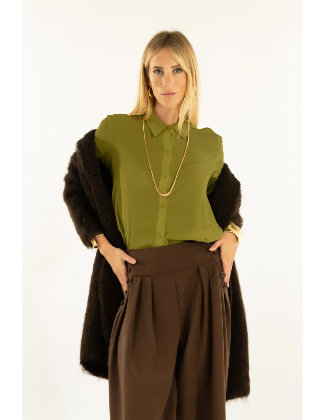 Kontatto reinterpreta o icónico top com abotoamento à frente, com corte ajustado mas fluido, que realça a silhueta sem apertar. Tecido leve e suave ao toque, com efeito acetinado. Gola limpa e botões da mesma cor, bainha arredondada para usar por dentro ou por fora. Perfeito para o escritório e para um look chique do dia a dia.