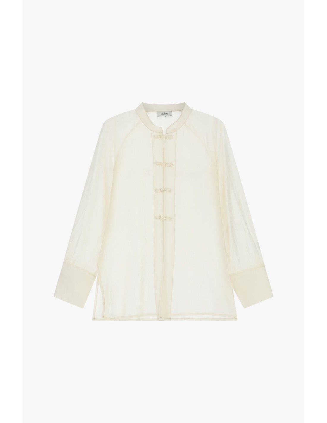 Deixa-te conquistar por esta camisa transparente que dá um toque delicado e original ao teu look quotidiano. Os botões de nó à oriental na parte frontal captam logo a atenção, enquanto o corte recto e as mangas compridas com punhos largos te oferecem liberdade de movimento para qualquer ocasião.