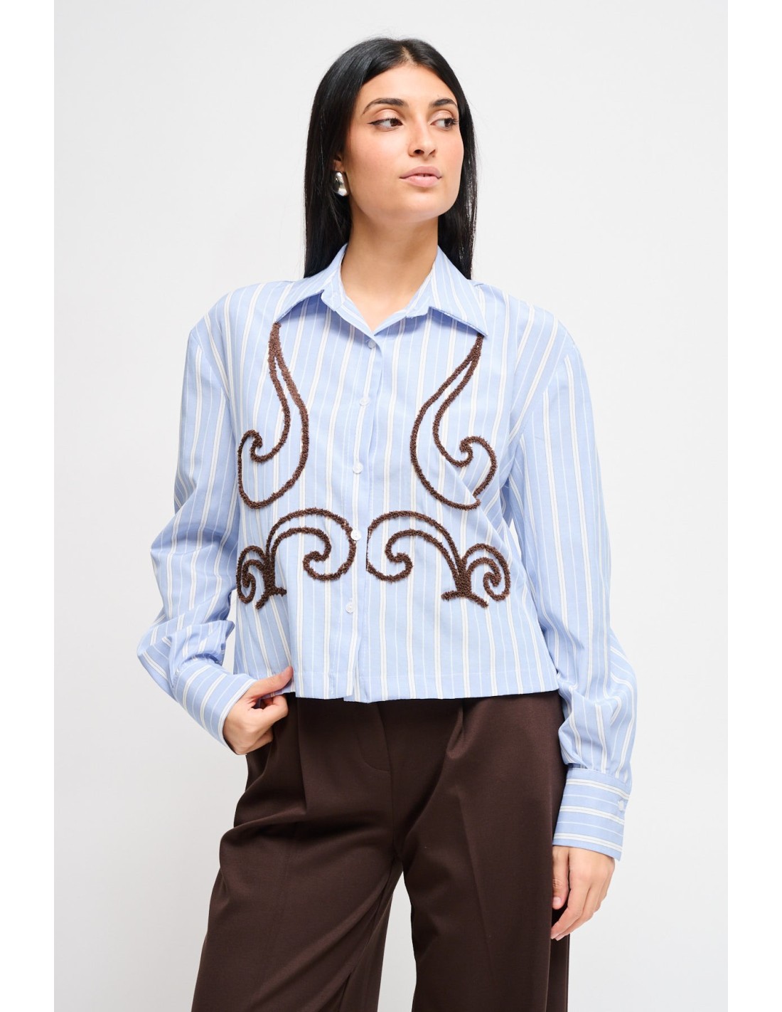 Maryley propõe uma camisa cropped com corte solto e direito que realça a silhueta sem apertar. Popeline leve com riscas e textura bordada em motivo ondulado, gola clássica e botões frontais. Versátil para o dia: perfeita com um fato para o escritório ou com denim de cintura subida para um look diário cuidado.