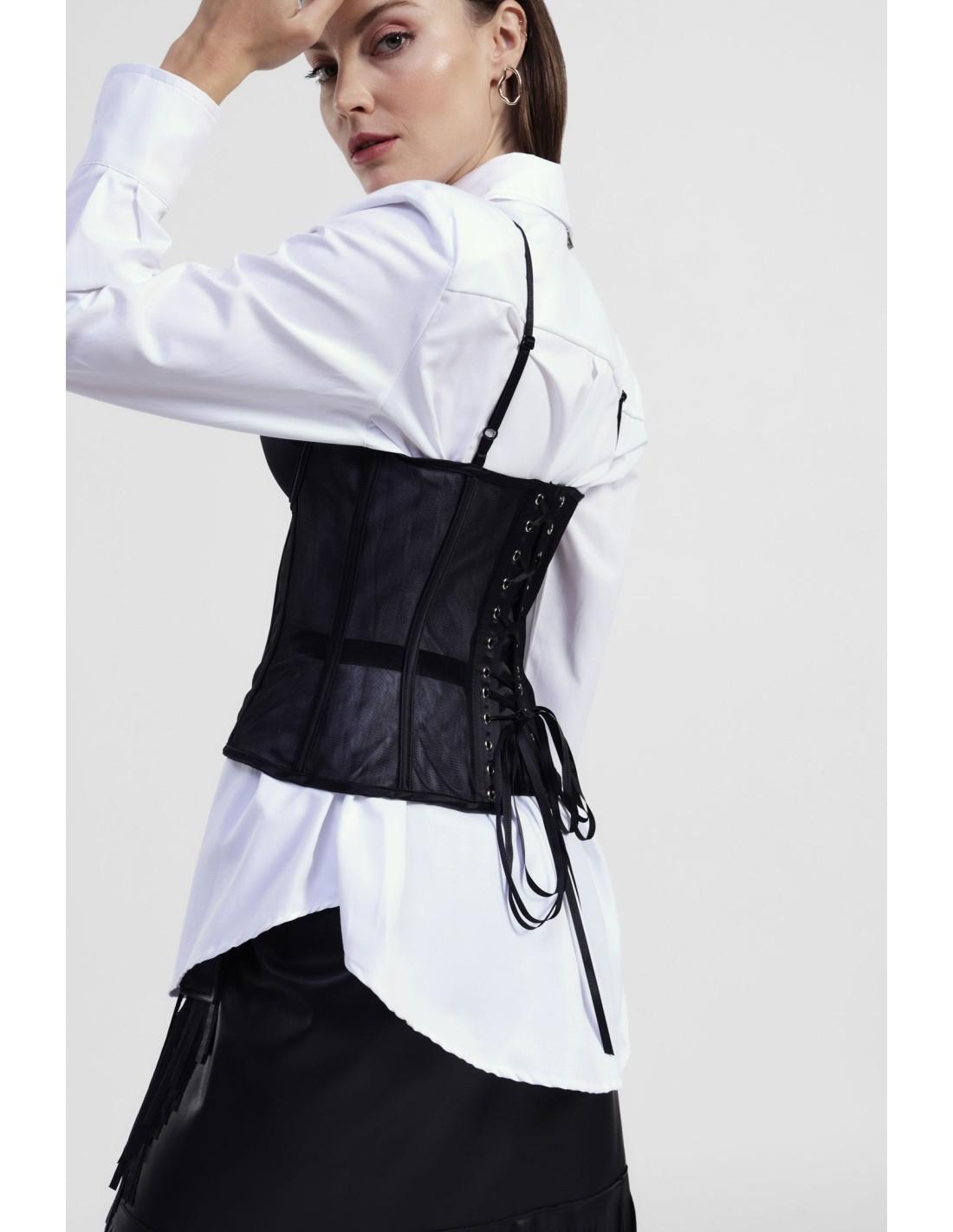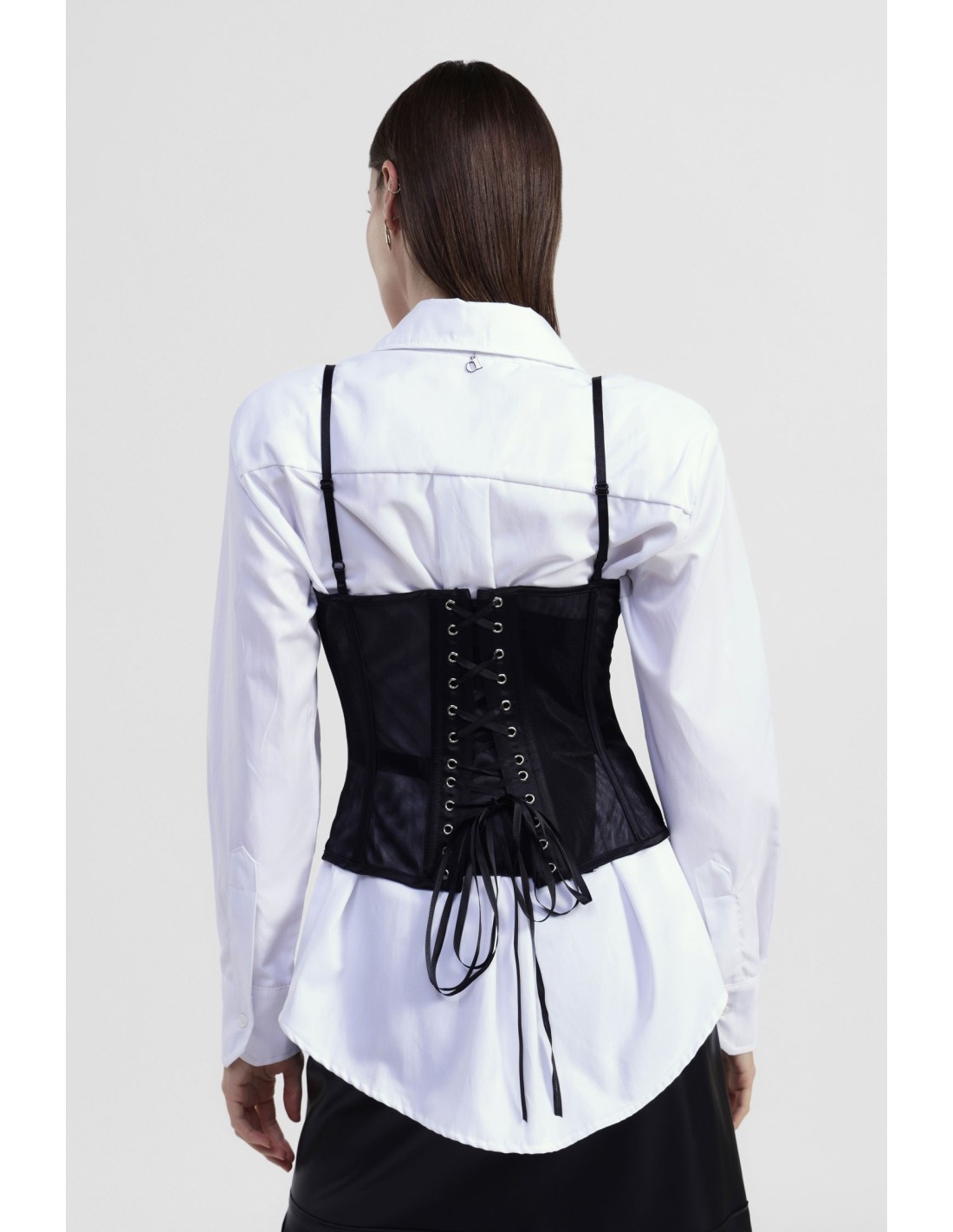 Esta camisa apresenta uma linha clássica enriquecida por um bustiê transparente com alças finas e pormenor com tiras estruturadas. A parte posterior distingue-se pelo fecho ajustável com cordões. Perfeita para quem deseja expressar personalidade e criatividade todos os dias, adaptando-se tanto a looks casuais como a estilos mais especiais.