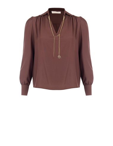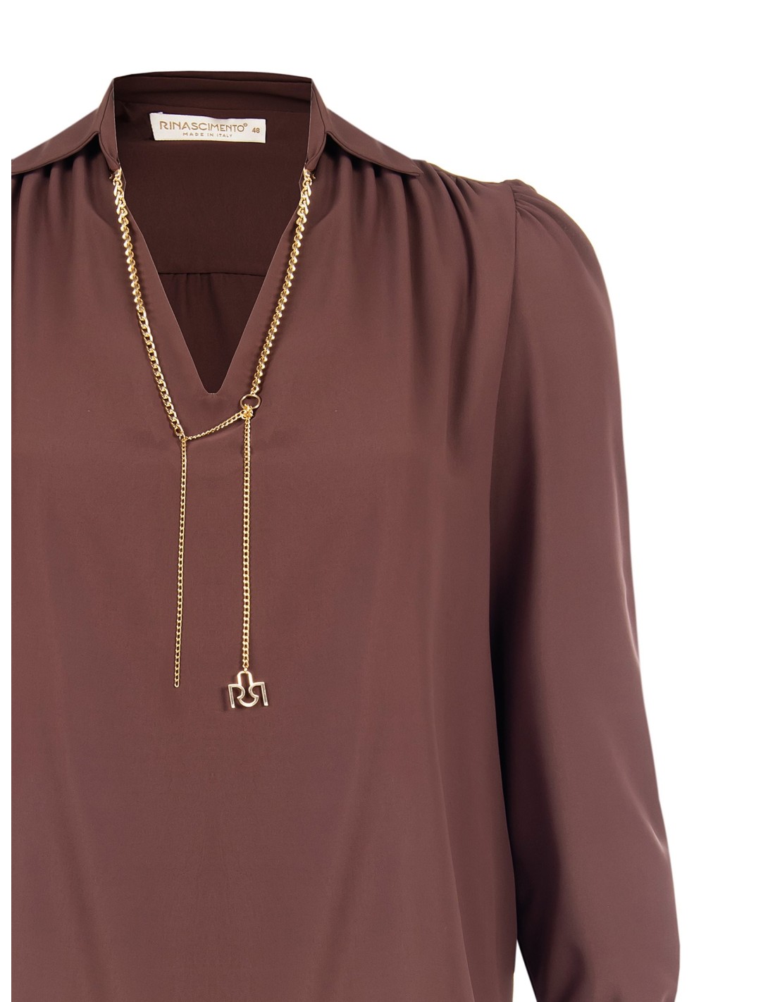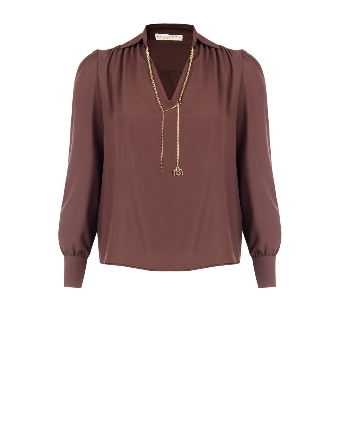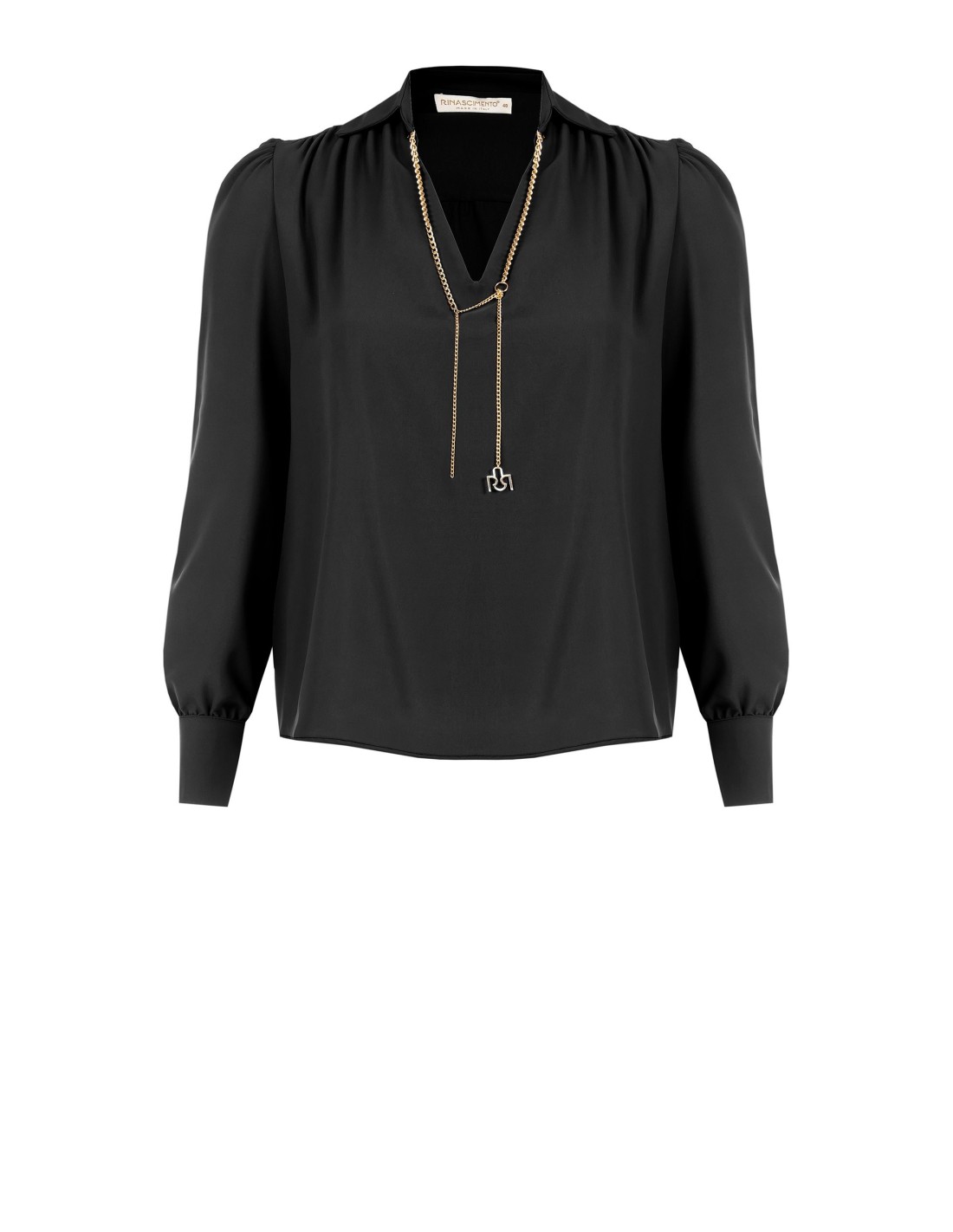 Blusa fluida Rinascimento Curvy, ajuste suave que valoriza a silhueta. Em cetim claro, agradável para a pele. Decote em V com corrente de jóias amovível e franzidos nos ombros. Mangas com punhos estruturados. Perfeito do escritório ao aperitivo, mesmo debaixo de um blazer ou com ganga.