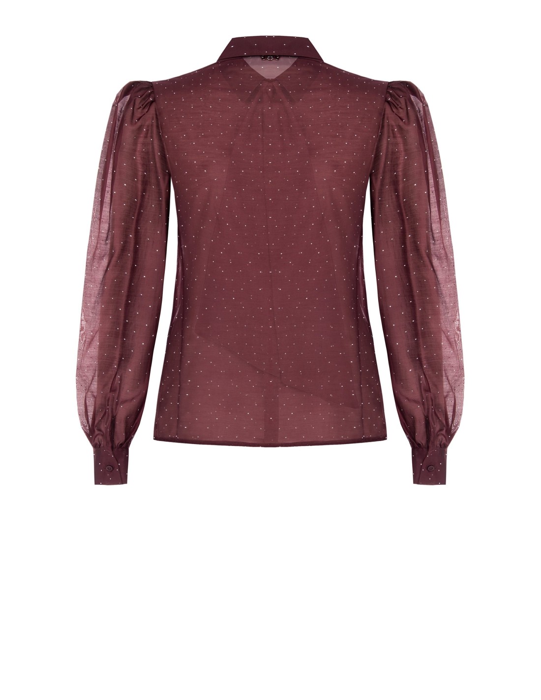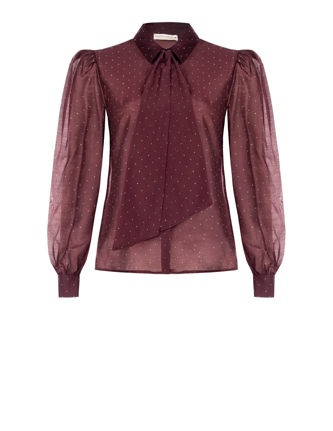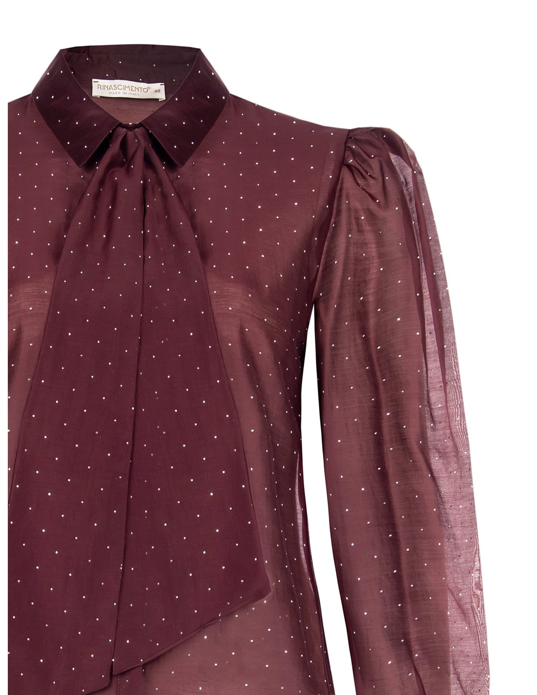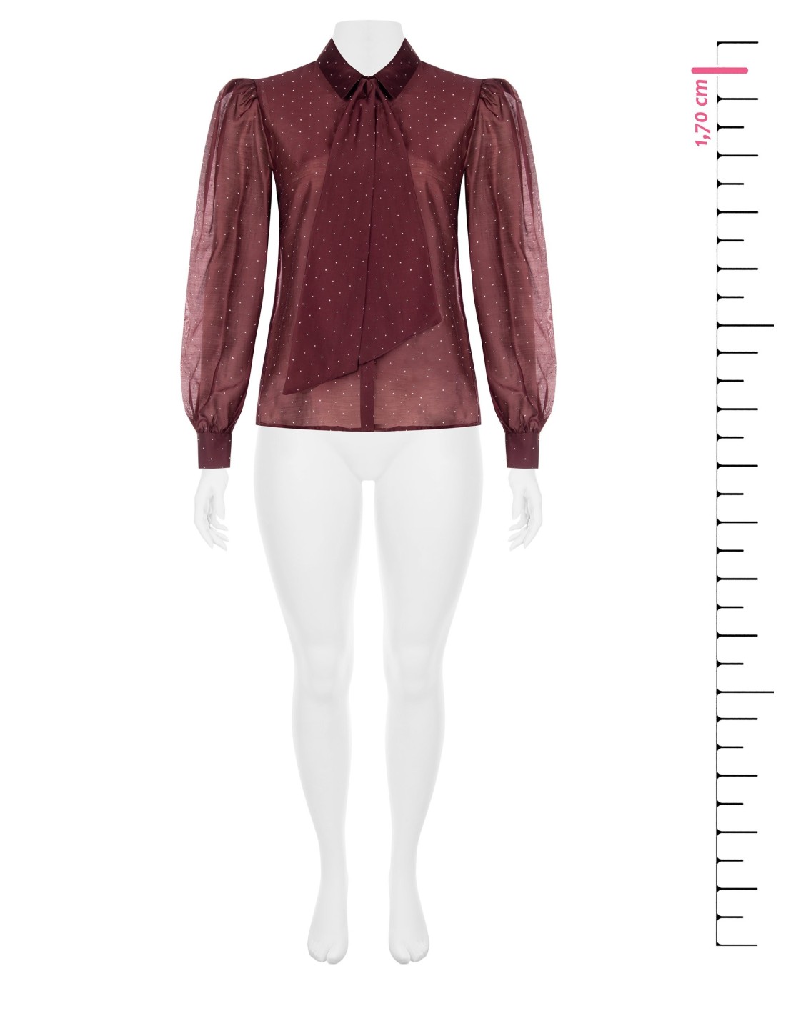 Rinascimento Curvy assina um top arejado com um corte solto que acaricia a silhueta. Tecido leve e semi-transparente embelezado com micro strass em toda a peça. Gola com laço maxi e mangas bufantes com punho alto: pormenores que favorecem e alegram. Perfeito para ir do escritório à festa e noites especiais.