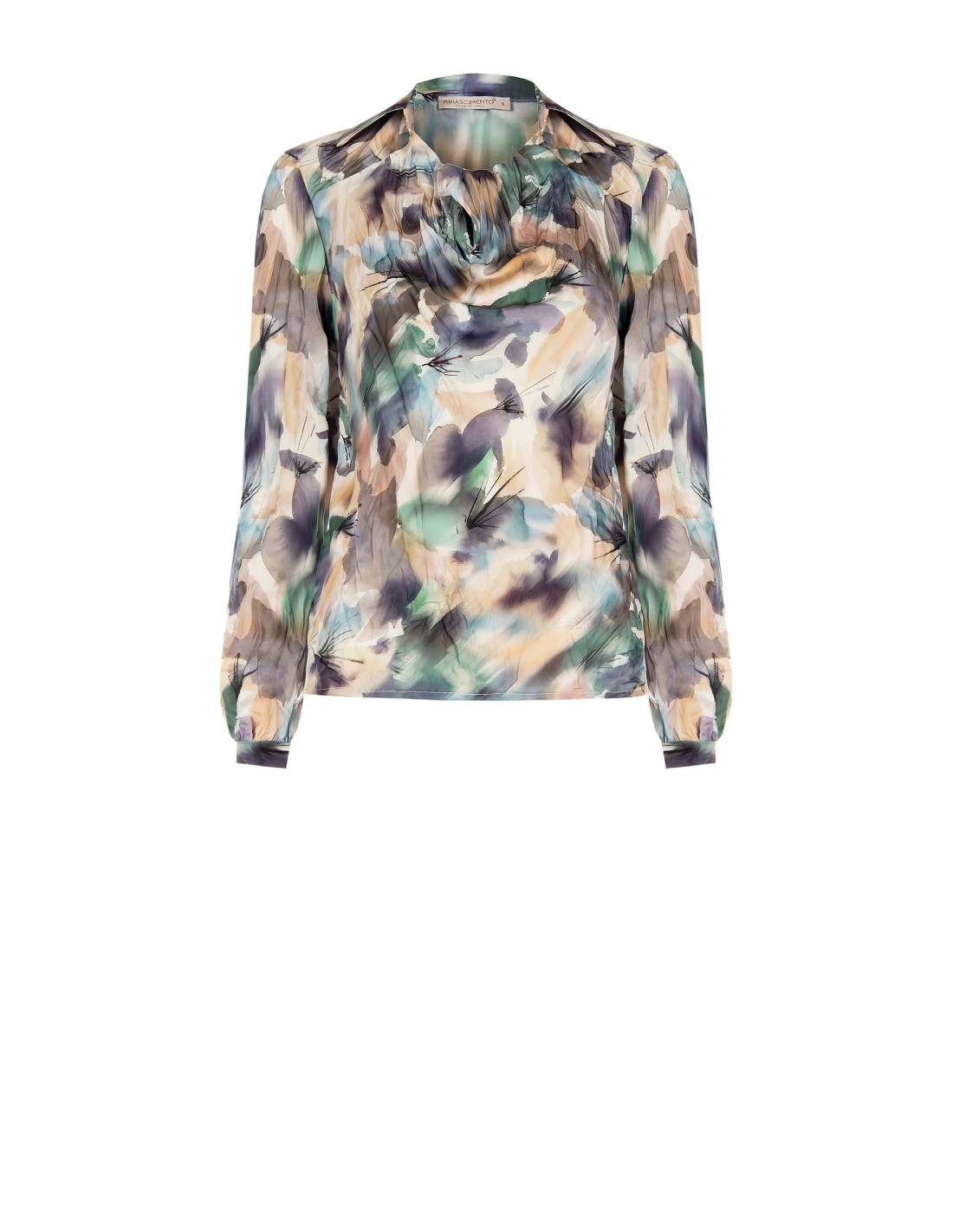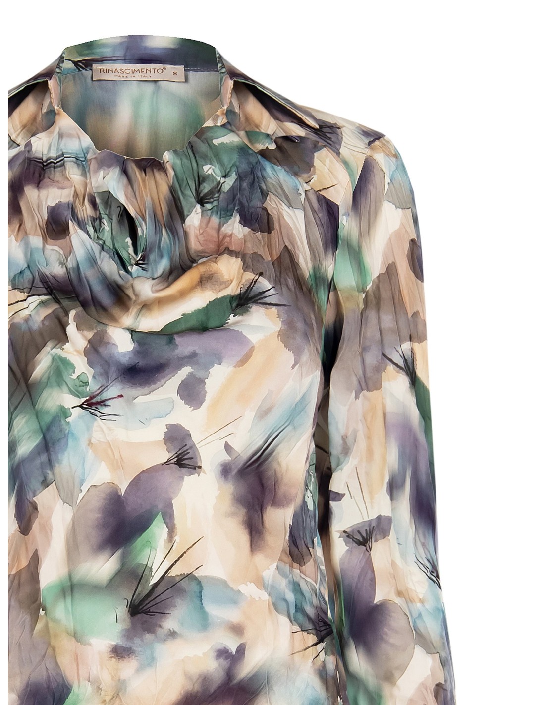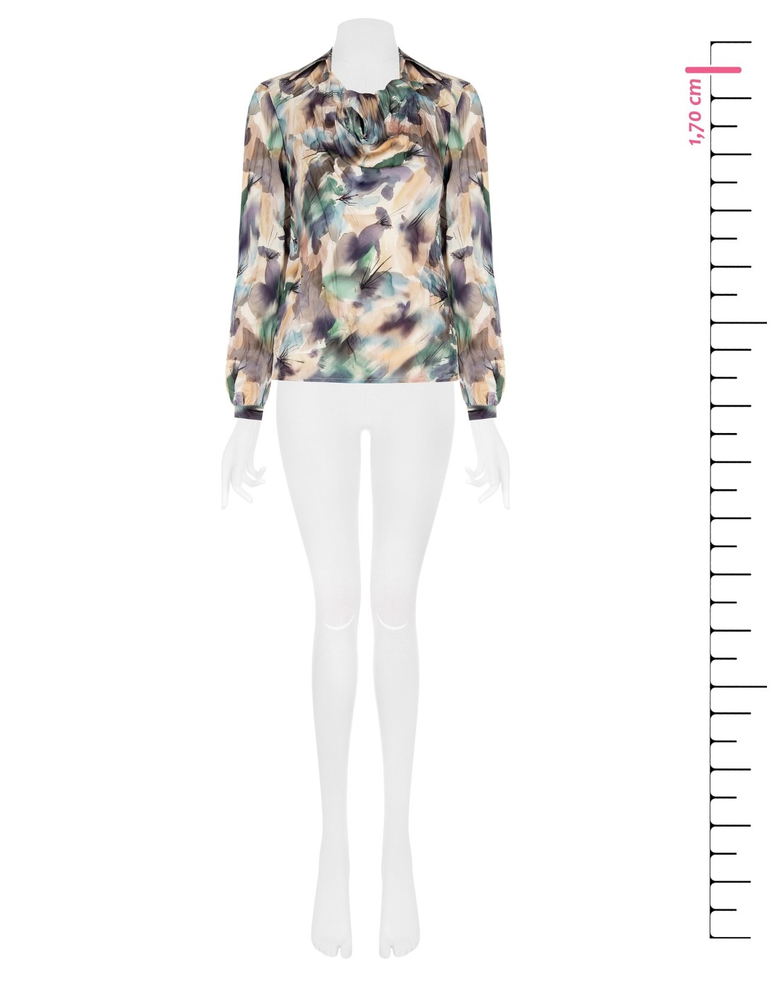 Blusa Rinascimento com um corte fluido que acompanha a silhueta sem marcar. Confeccionada em cetim leve com textura ondulada, proporciona conforto e luminosidade. Decote em anel drapeado e mangas com punho franzido realçam o decote. Perfeita do escritório ao aperitivo, combina com fato e denim.