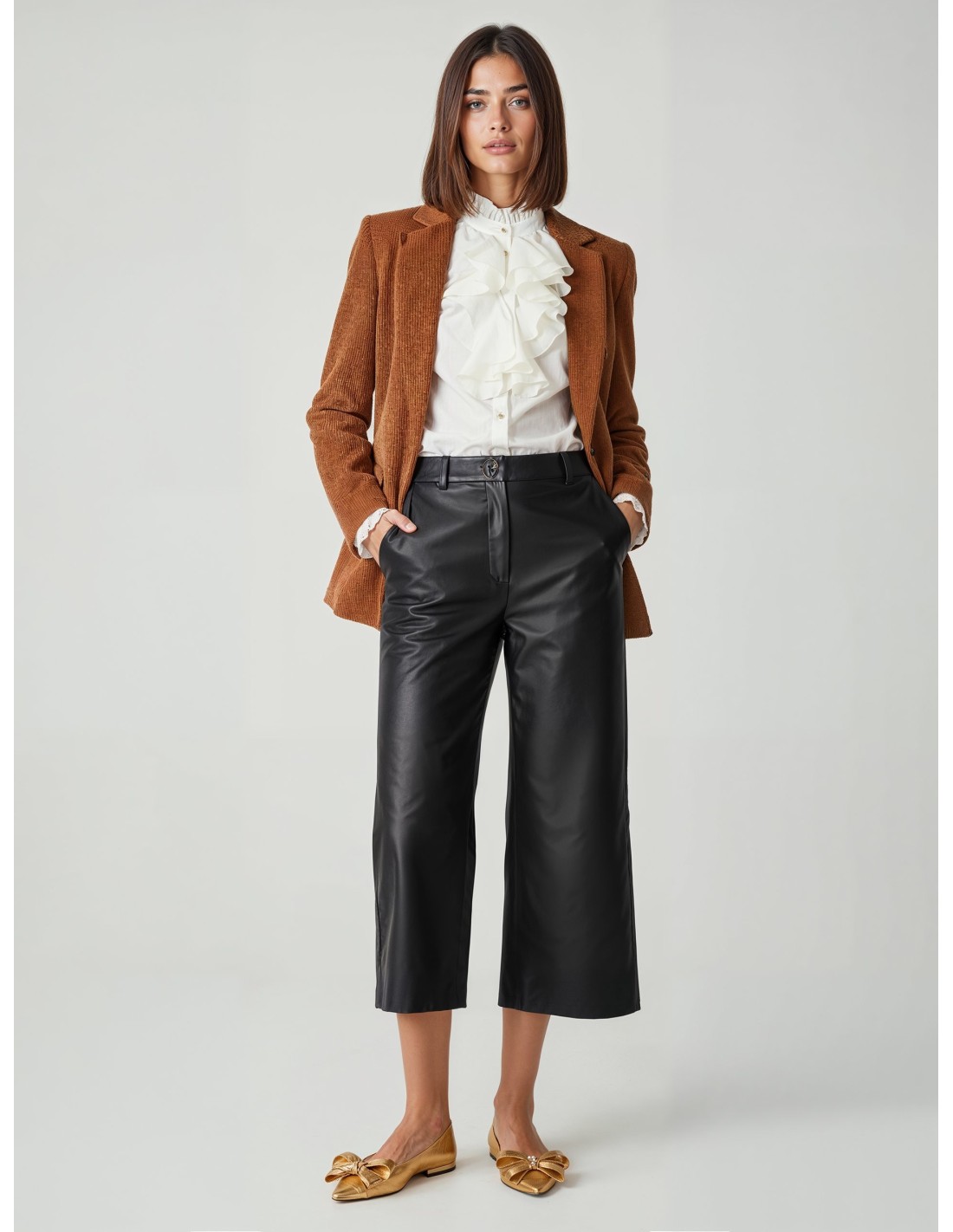Rinascimento apresenta uma blusa de corte feminino e ligeiramente justo, em TENCEL macio e arejado com transparências discretas. Os folhos frontais e a gola franzida valorizam a silhueta; botões tipo joia e punhos em forma de sino acrescentam personalidade. Perfeita para o escritório com blazer, também ideal para aperitivos e jantares.
