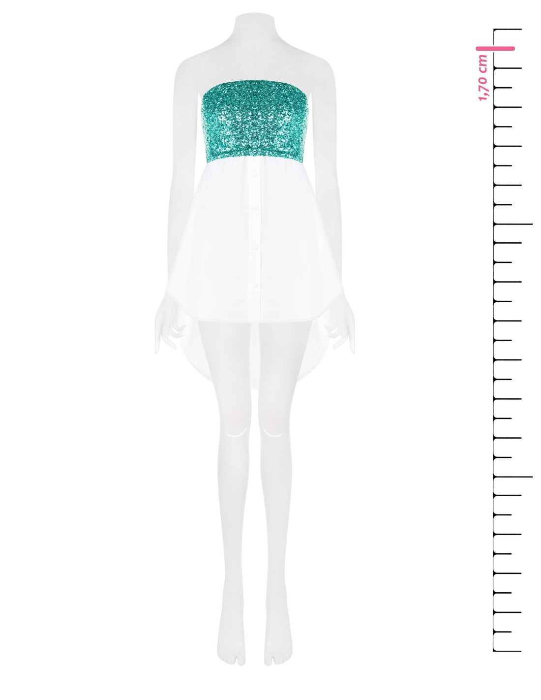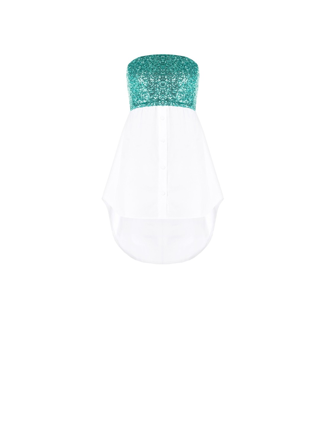 Top sem alças com ajuste suave e evasado, pensado para valorizar a silhueta com leveza. O corpete revestido de paetês encontra um tecido fresco e fluido, enquanto o decote reto e os botões frontais acrescentam carácter. Perfeito para festas, aperitivos e eventos especiais.