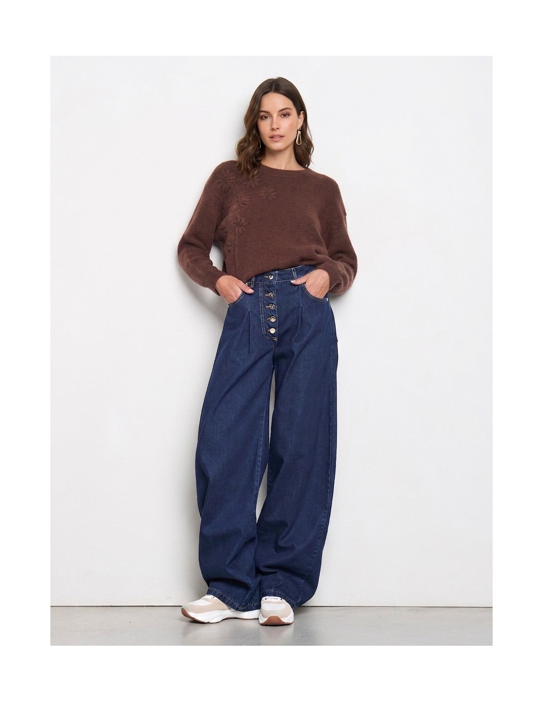 Malha suave com corte relaxed, envolve com leveza e acompanha a silhueta sem marcar. A textura macia é valorizada pelo decote redondo e pelas flores em relevo na frente. Perfeita para o escritório e para looks do dia a dia com um toque feminino.