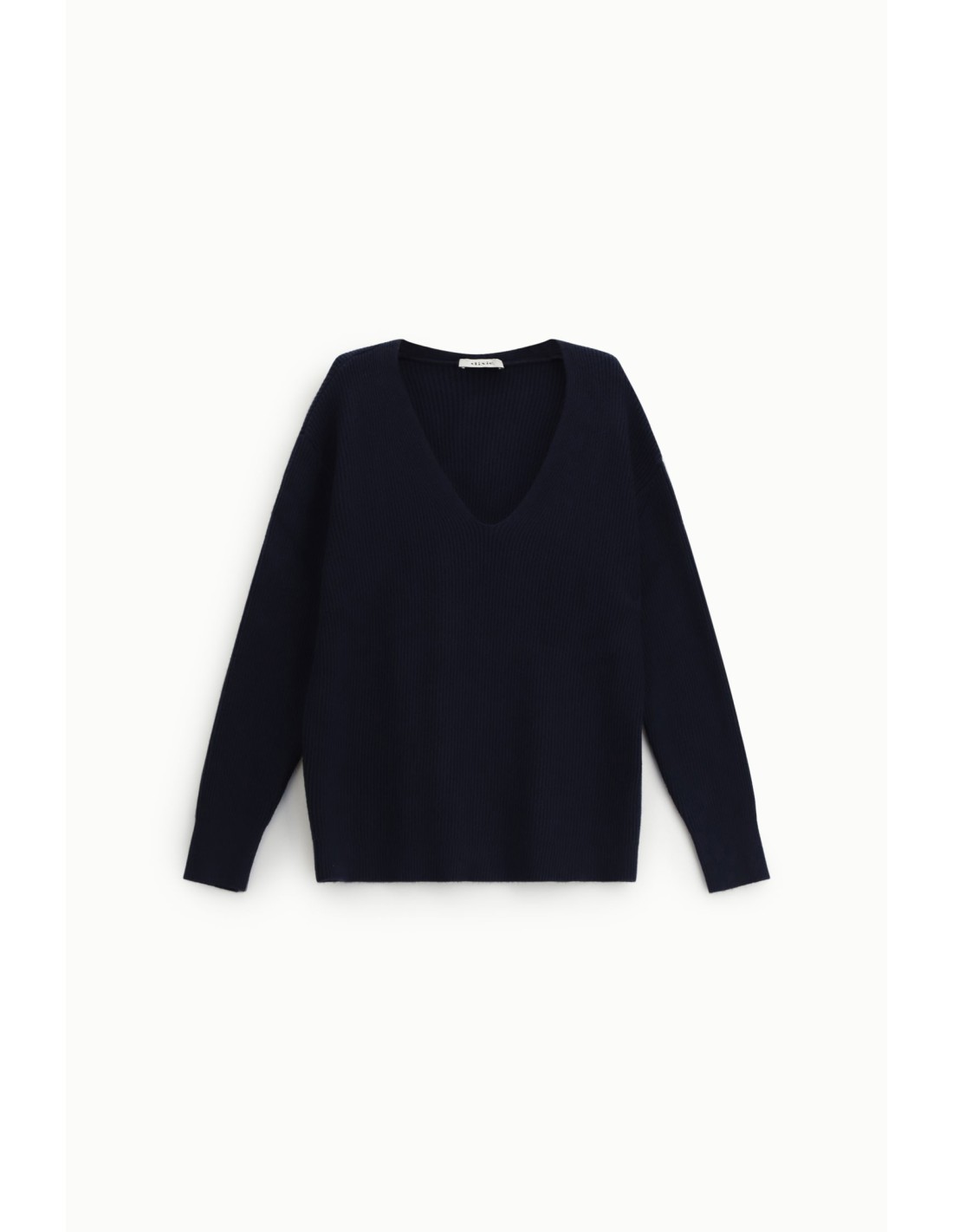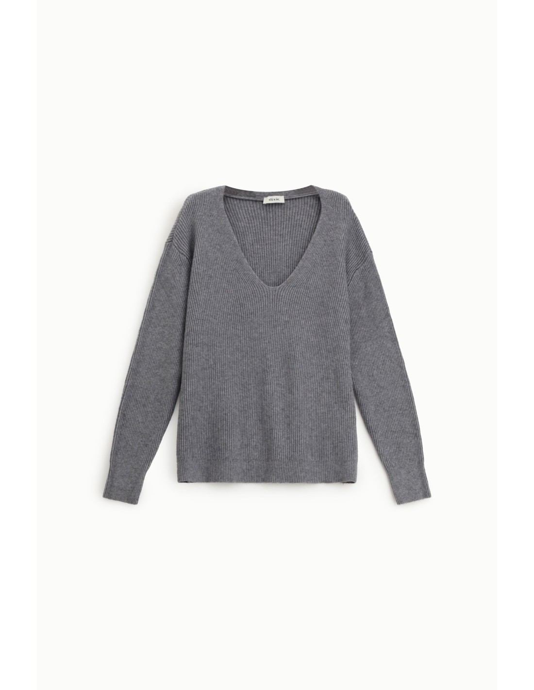 Perfeita para qualquer momento do dia, esta camisola com decote em V e malha canelada confere uma nota feminina e versátil ao teu guarda-roupa. O corte fluido valoriza a silhueta sem prescindir do conforto, ideal tanto com calças como com saias para um estilo original e cuidado.