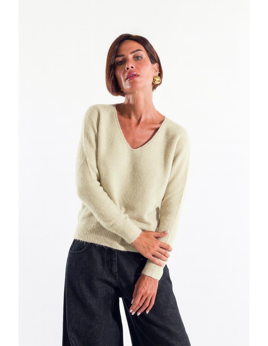 Kontatto assina um pullover de corte macio e feminino, em malha macia com efeito pelúcia e toque aveludado. Decote em V que alonga a silhueta, punhos e barra em canalé para um ajuste que envolve sem apertar. Perfeito do escritório ao tempo livre, para usar sozinho ou sobre camisas leves.