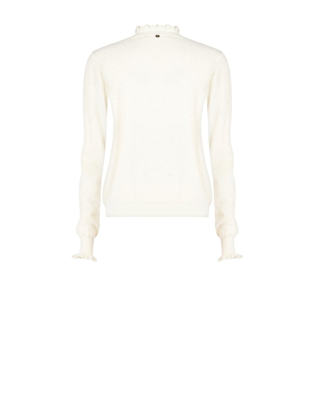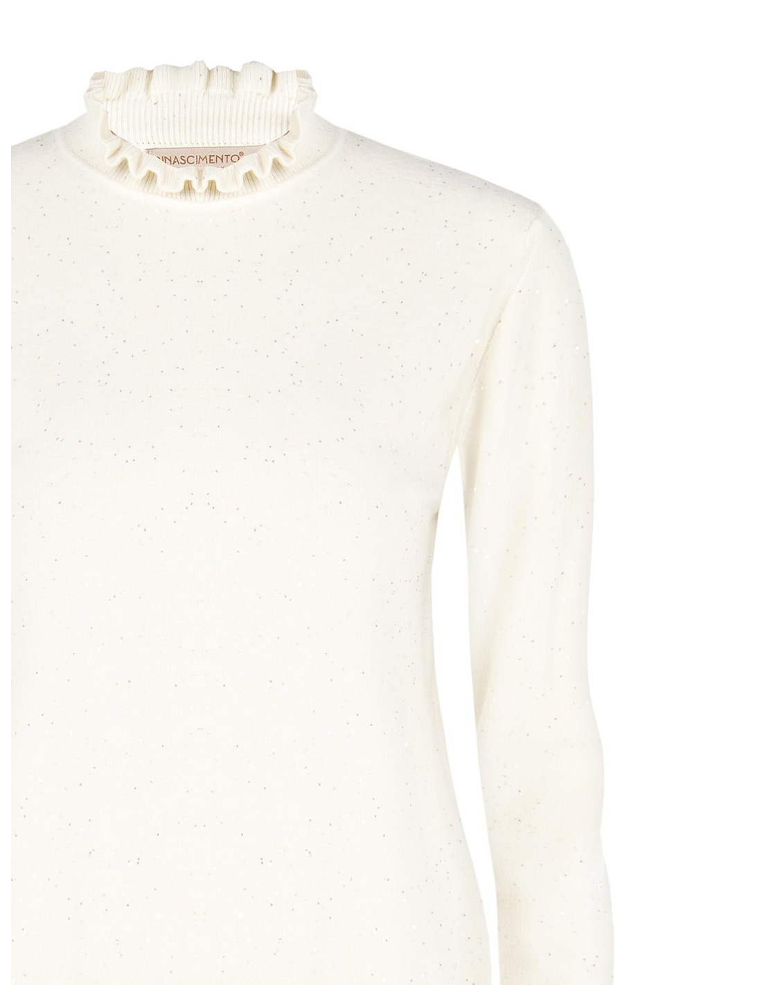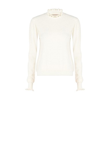 Camisola de ajuste seco e confortável Rinascimento em malha fina macia com micro-lantejoulas em toda a peça que proporcionam uma luz discreta. A gola com folhos e os punhos com folhos definem a silhueta. Versátil do escritório para depois do trabalho, fácil de combinar sob blazers ou com calças de ganga para uma elegância quotidiana.