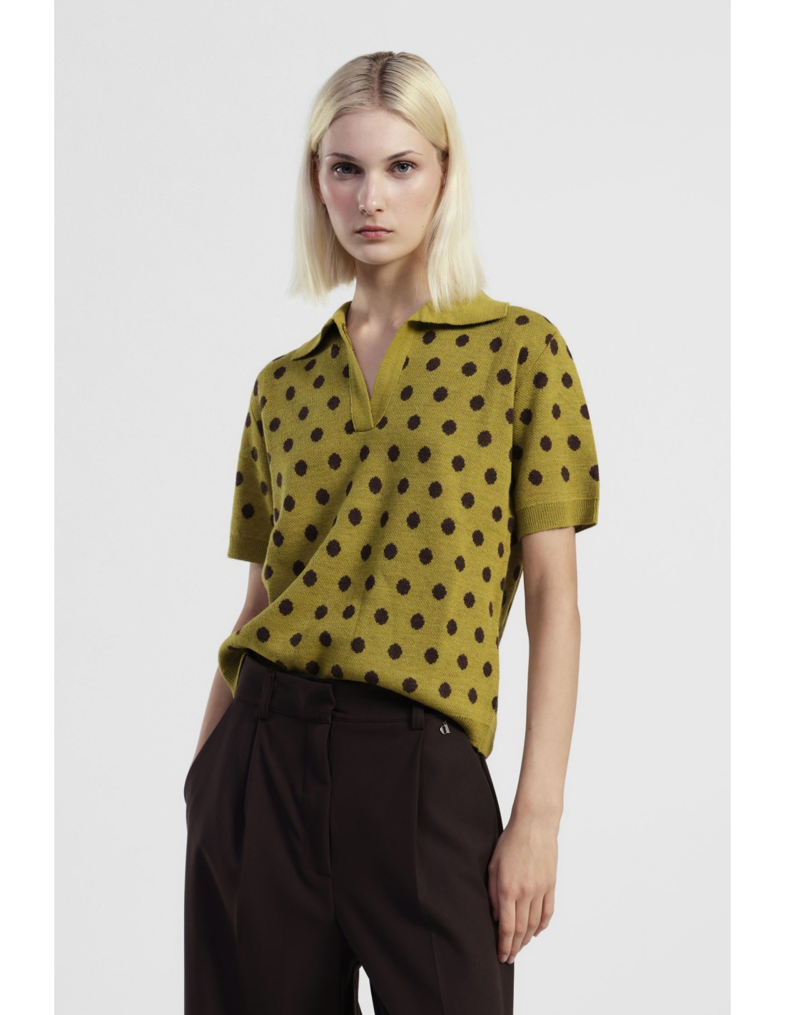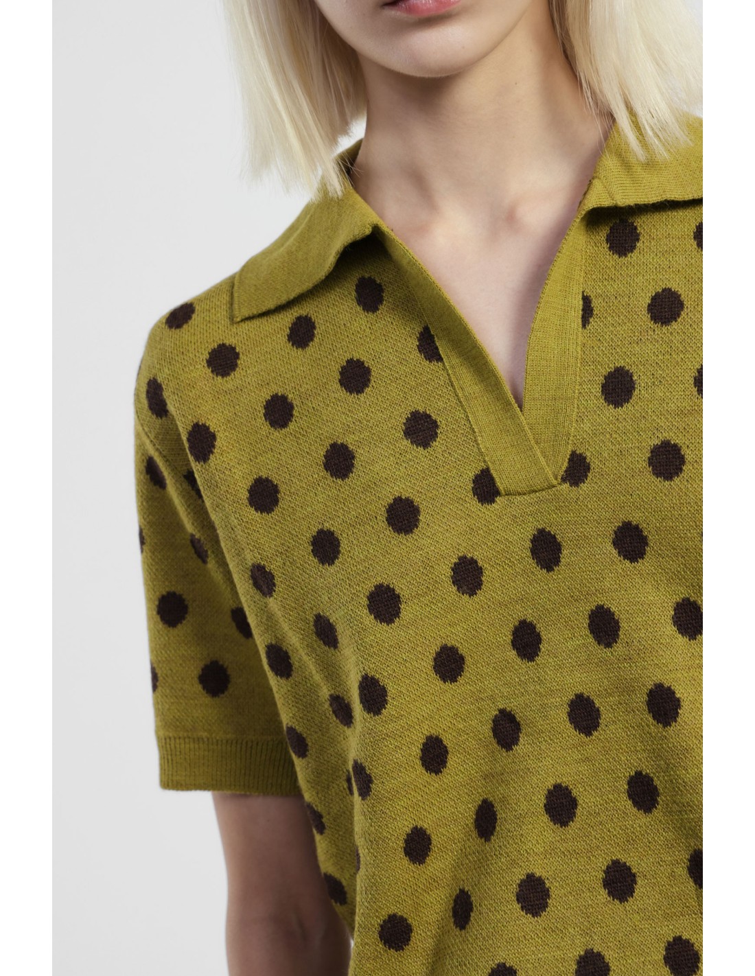 Leve e original, a camisola de manga curta com padrão de bolinhas e gola polo dá um toque divertido ao seu dia a dia. De corte regular e curto, é perfeita para vestir com calças de ganga ou com saias de cintura subida. Imagine-o para looks frescos e fáceis de usar.
