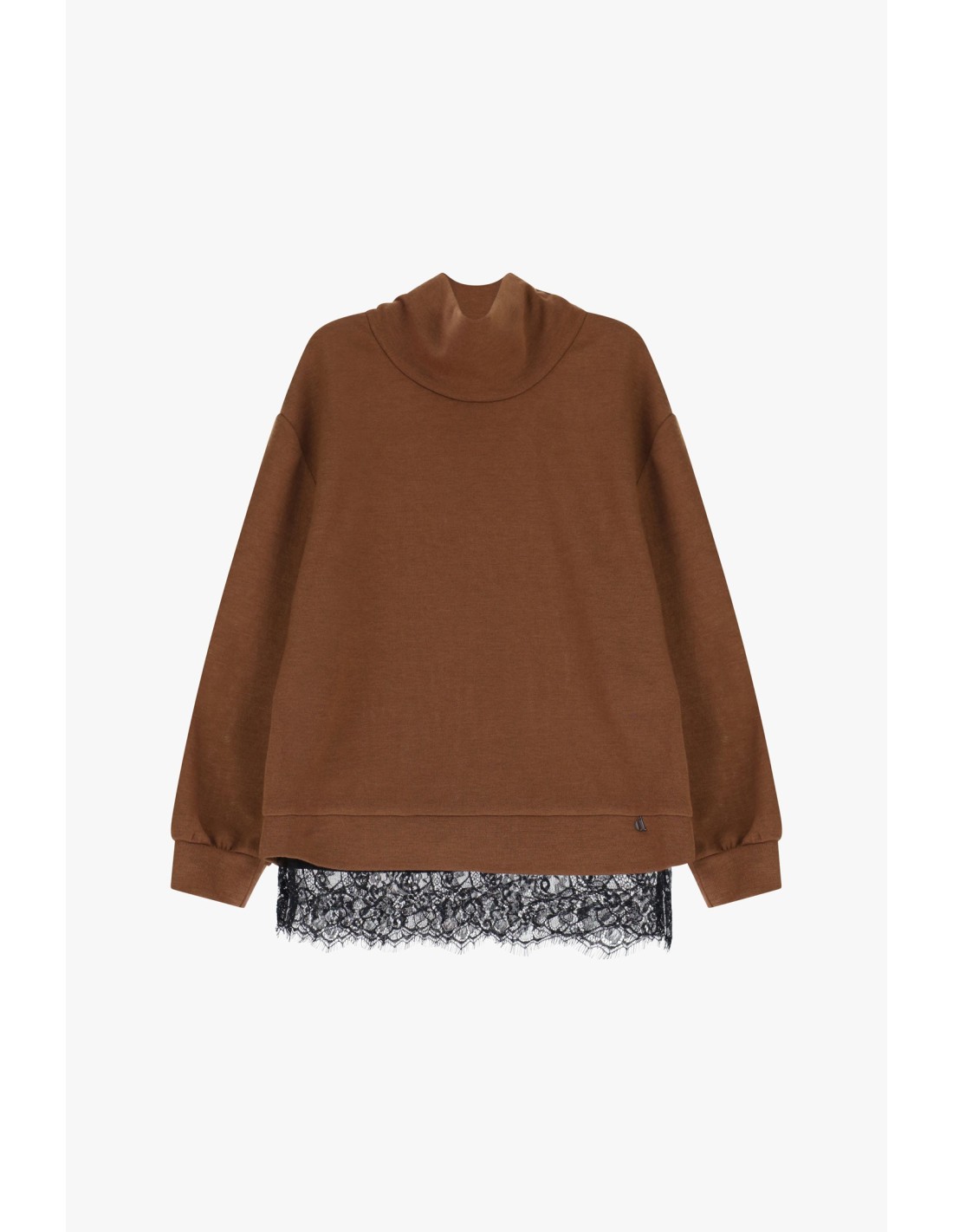 Deixa-te envolver pelo conforto desta camisola de gola alta, de corte relaxado e ajuste macio, pensada para te acompanhar em qualquer momento do dia. O painel de renda na parte inferior confere um toque original e refinado, realçando o estilo feminino e o cuidado com os detalhes. Perfeita com jeans ou calças clássicas.