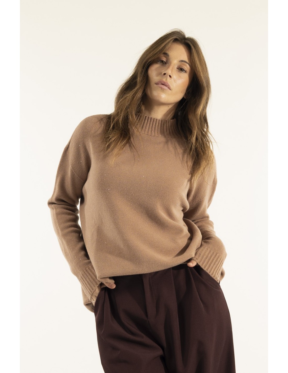 Camisola de gola alta de corte solto e fluido. Tricot macio com toque quente, acabamento ligeiramente mesclado. Gola canelada e bainha arredondada com punhos largos proporcionam conforto e uma linha feminina que não marca. Perfeita para o escritório com calças de alfaiataria ou para o dia a dia descontraído. Contexto: Kontatto.
