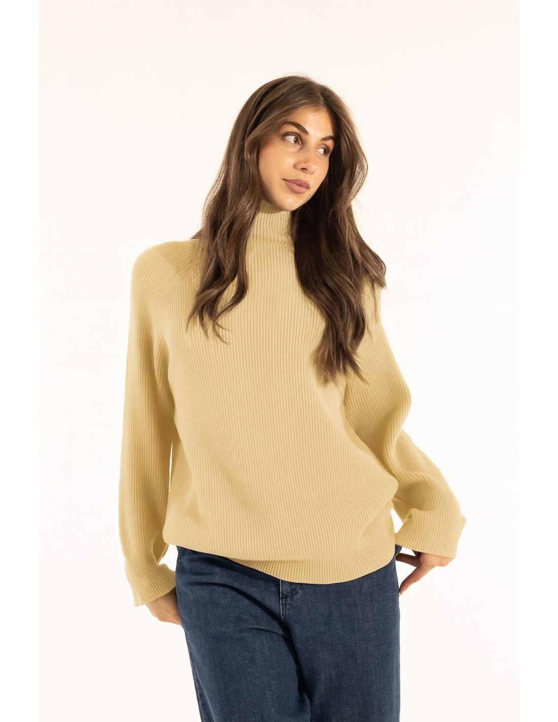 Camisola de gola alta com um corte macio e descontraído. Malha canelada em fio macio, quente e leve na pele. Ombros caídos e gola alta estruturada valorizam a silhueta sem marcar. Perfeita para o escritório com calças de alfaiataria ou para o dia a dia com ganga, garante conforto e versatilidade.